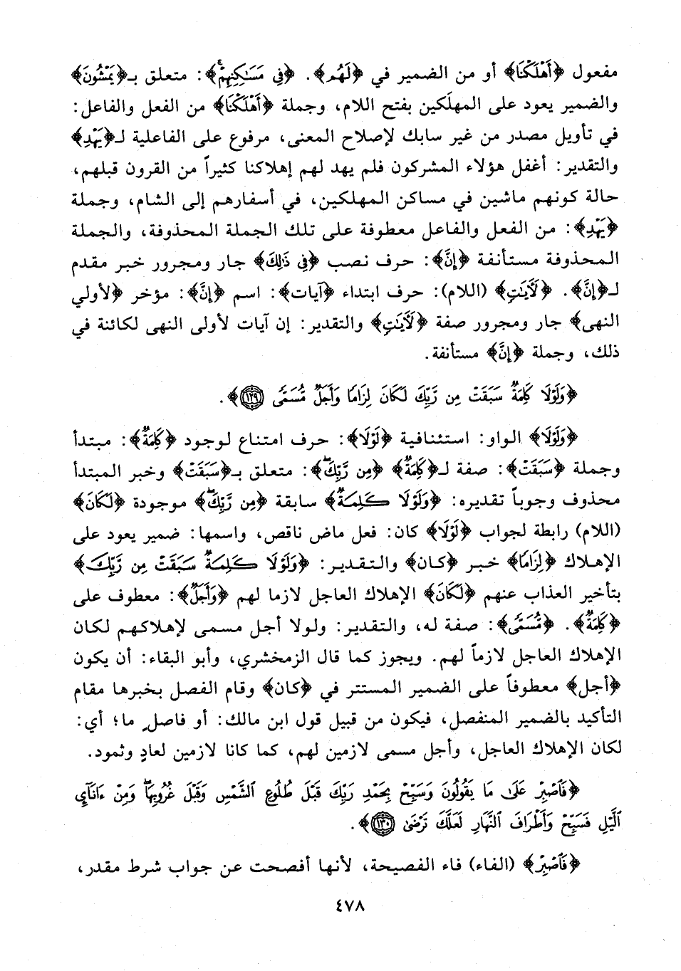 {وَلَوْلَا} الواو: استئنافية {لَوْلَا}: حرف امتناع لوجود {كَلِمَةٌ}: مبتدأ وجملة {سَبَقَتْ}: صفة لـ {كَلِمَةٌ} {مِنْ رَبِّكَ}: متعلق بـ {سَبَقَتْ} وخبر المبتدأ محذوف وجوبًا تقديره: {وَلَوْلَا كَلِمَةٌ} سابقة {مِنْ رَبِّكَ} موجودة {لَكَانَ} (اللام) رابطة لجواب {لَوْلَا} كان: فعل ماض ناقص، واسمها: ضمير يعود على الإهلاك {لِزَامًا} خبر {كان} والتقدير: {وَلَوْلَا كَلِمَةٌ سَبَقَتْ مِنْ رَبِّكَ} بتأخير العذاب عنهم {لَكَانَ} الإهلاك العاجل لازما لهم {وَأَجَلٌ}: معطوف على {كَلِمَةٌ}. {مُسَمًّى}: صفة له، والتقدير: ولولا أجل مسمى لإهلاكهم لكان الإهلاك العاجل لازمًا لهم. ويجوز كما قال الزمخشري، وأبو البقاء: أن يكون {أجل} معطوفًا على الضمير المستتر في {كان} وقام الفصل بخبرها مقام التأكيد بالضمير المنفصل، فيكون من قبيل قول ابن مالك: أو فاصلٍ ما؛ أي: لكان الإهلاك العاجل، وأجل مسمى لازمين لهم، كما كانا لازمين لعادٍ وثمودٍ.