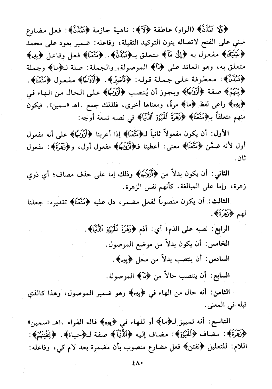 {وَلَا تَمُدَّنَّ} {الواو} عاطفة {لَا}: ناهية جازمة {تَمُدَّنَّ}: فعل مضارع مبني على الفتح لاتصاله بنون التوكيد الثقيلة، وفاعله: ضمير يعود على محمد {عَيْنَيْكَ} مفعول به {إِلَى مَا} متعلق بـ {تَمُدَّنَّ}. {مَتَّعْنَا} فعل وفاعل {بِهِ} متعلق به، وهو العائد على {مَا} الموصولة، والجملة: صلة لـ {ما} وجملة {تَمُدَّنَّ}: معطوفة على جملة قوله: {فَاصْبِرْ}. {أَزْوَاجًا} مفعول {مَتَّعْنَا}. {مِنْهُمْ} صفة {أَزْوَاجًا} ويجوز أن يُنصب {أَزْوَاجًا} على الحال من الهاء في {بِهِ} راعى لفظ {ما} مرةً، ومعناها أخرى، فلذلك جمع. اهـ "سمين". فيكون منهم متعلقاٌ بـ {مَتَّعْنَا} {زَهْرَةَ الْحَيَاةِ الدُّنْيَا} في نصبه تسعة أوجه: