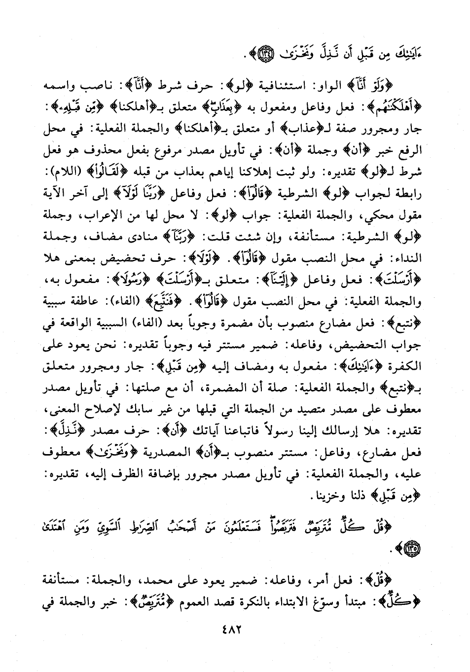 {وَلَوْ أَنَّا} الواو: استئنافية {لو}: حرف شرط {أَنَّا}: ناصب واسمه {أَهْلَكْنَاهُمْ}: فعل وفاعل ومفعول به {بِعَذَابٍ} متعلق بـ {أهلكنا} {مِنْ قَبْلِهِ}: جار ومجرور صفة لـ {عذاب} أو متعلق بـ {أهلكنا} والجملة الفعلية: في محل الرفع خبر {أن} وجملة {أن}: في تأويل مصدر مرفوع بفعل محذوف هو فعل شرط لـ {لو} تقديره: ولو ثبت إهلاكنا إياهم بعذاب من قبله {لَقَالُوا} (اللام): رابطة لجواب {لو} الشرطية {قَالُوا}: فعل وفاعل {رَبَّنَا لَوْلَا} إلى آخر الآية مقول محكي، والجملة الفعلية: جواب {لو}: لا محل لها من الإعراب، وجملة {لو} الشرطية: مستأنفة، وإن شئت قلت: {رَبَّنَا} منادى مضاف، وجملة النداء: في محل النصب مقول {قَالُوا}. {لَوْلَا}: حرف تحضيض بمعنى هلا {أَرْسَلْتَ}: فعل وفاعل {إِلَيْنَا}: متعلق بـ {أَرْسَلْتَ} {رَسُولًا}: مفعول به، والجملة الفعلية: في محل النصب مقول {قَالُوا}. {فَنَتَّبِعَ} {الفاء}: عاطفة سببية {نتبع}: فعل مضارع منصوب بأن مضمرة وجوبًا بعد {الفاء} السببية الواقعة في جواب التحضيض، وفاعله: ضمير مستتر فيه وجوبًا تقديره: نحن يعود على الكفرة {آيَاتِكَ}: مفعول به ومضاف إليه {مِنْ قَبْلِ}: جار ومجرور متعلق بـ {نتبع} والجملة الفعلية: صلة أن المضمرة، أن مع صلتها: في تأويل مصدر معطوف على مصدر متصيد من الجملة التي قبلها من غير سابك لإصلاح المعنى، تقديره: هلا إرسالك إلينا رسولًا فاتباعنا آياتك {أَنْ}: حرف مصدر {نَذِلَّ}: فعل مضارع، وفاعل: مستتر منصوب بـ {أَنْ} المصدرية {وَنَخْزَى} معطوف عليه، والجملة الفعلية: في تأويل مصدر مجرور بضافة الظرف إليه، تقديره: {مِنْ قَبْلِ} ذلنا وخزينا.