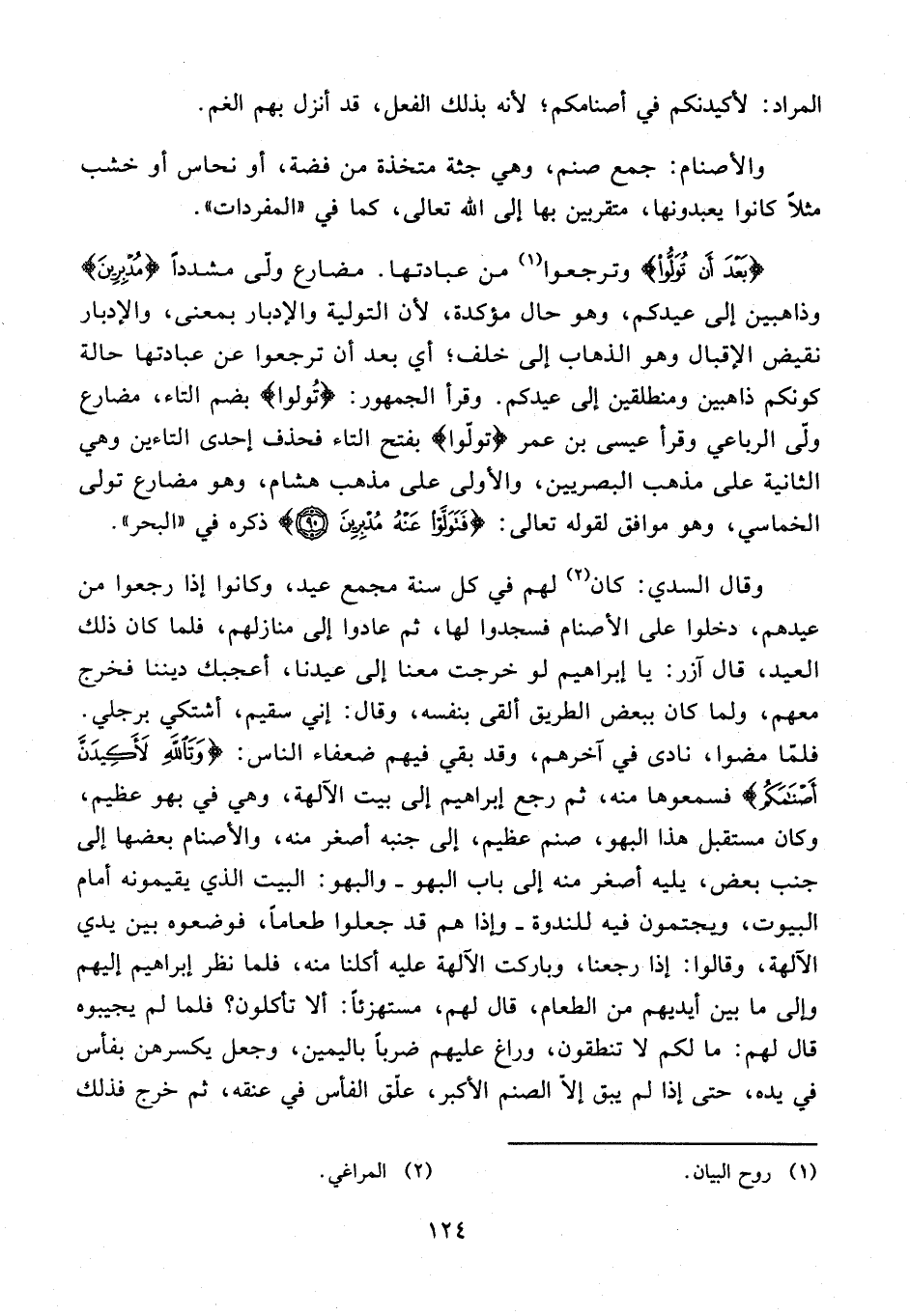 وقال السدي: كان (¬2) لهم في كل سنة مجمع عيد، وكانوا إذا رجعوا من عيدهم، دخلوا على الأصنام فسجدوا لها، ثم عادوا إلى منازلهم، فلما كان ذلك العيد، قال آزر: يا إبراهيم لو خرجت معنا إلى عيدنا، أعجبك ديننا فخرج معهم، ولما كان ببعض الطريق ألقى بنفسه، وقال: إني سقيم، أشتكي برجلي. فلمّا مضوا، نادى في آخرهم، وقد بقي فيهم ضعفاء الناس: {وَتَاللَّهِ لَأَكِيدَنَّ أَصْنَامَكُمْ} فسمعوها منه، ثم رجع إبراهيم إلى بيت الآلهة، وهي في بهو عظيم، وكان مستقبل هذا البهو، صنم عظيم، إلى جنبه أصغر منه، والأصنام بعضها إلى جنب بعض، يليه أصغر منه إلى باب البهو - والبهو: البيت الذي يقيمونه أمام البيوت، ويجتمون فيه للندوة - وإذا هم قد جعلوا طعامًا، فوضعوه بين يدي الآلهة، وقالوا: إذا رجعنا، وباركت الآلهة عليه أكلنا منه، فلما نظر إبراهيم إليهم وإلى ما بين أيديهم من الطعام، قال لهم، مستهزئًا: ألا تأكلون؟ فلما لم يجيبوه قال لهم: ما لكم لا تنطقون، وراغ عليهم ضربًا باليمين، وجعل يكسرهن بفأس في يده، حتى إذا لم يبق إلّا الصنم الأكبر، علّق الفأس في عنقه، ثم خرج فذلك
