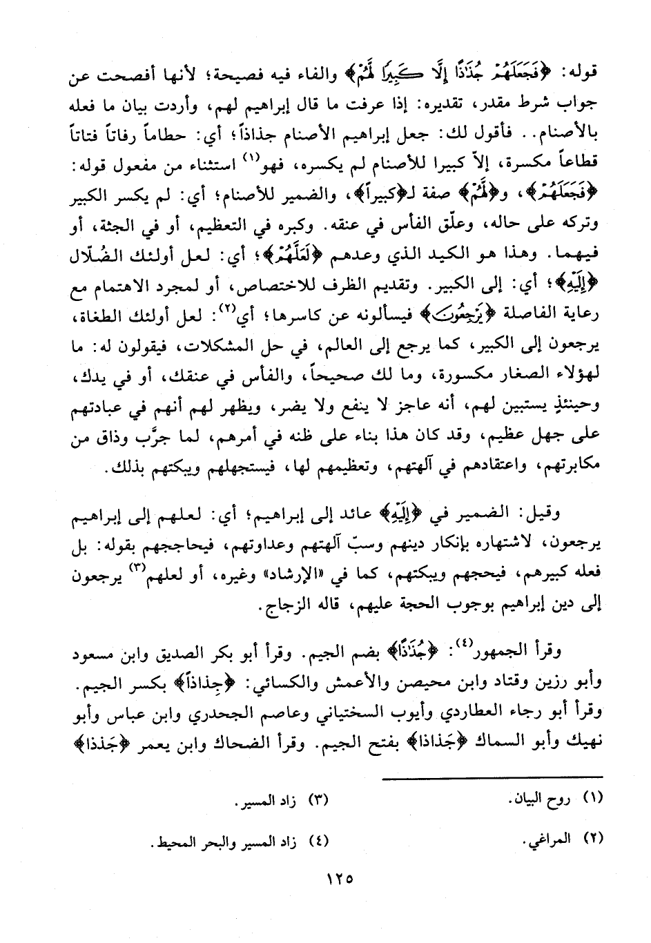 58 - قوله: {فَجَعَلَهُمْ جُذَاذًا إِلَّا كَبِيرًا لَهُمْ} والفاء فيه فصيحة؛ لأنها أفصحت عن جواب شرط مقدر، تقديره: إذا عرفت ما قال إبراهيم لهم، وأردت بيان ما فعله بالأصنام .. فأقول لك: جعل إبراهيم الأصنام جذاذًا؛ أي: حطاماً رفاتاً فتاتاً قطاعاً مكسرة، إلّا كبيرا للأصنام لم يكسره، فهو (¬1) استثناء من مفعول قوله: {فَجَعَلَهُمْ}، و {لَهُمْ} صفة لـ {كَبِيرًا}، والضمير للأصنام؛ أي: لم يكسر الكبير وتركه على حاله، وعلّق الفأس في عنقه. وكبره في التعظيم، أو في الجثة، أو فيهما. وهذا هو الكيد الذي وعدهم {لَعَلَّهُمْ}؛ أي: لعل أولئك الضُلّال {إِلَيْهِ}؛ أي: إلى الكبير. وتقديم الظرف للاختصاص، أو لمجرد الاهتمام مع رعاية الفاصلة {يَرْجِعُونَ} فيسألونه عن كاسرها؛ أي (¬2): لعل أولئك الطغاة، يرجعون إلى الكبير، كما يرجع إلى العالم، في حل المشكلات، فيقولون له: ما لهؤلاء الصغار مكسورة، ومالك صحيحًا، والفأس في عنقك، أو في يدك، وحينئذٍ يستبين لهم، أنه عاجز لا ينفع ولا يضر، ويظهر لهم أنهم في عبادتهم على جهل عظيم، وقد كان هذا بناء على ظنه في أمرهم، لما جرَّب وذاق من مكابرتهم، واعتقادهم في آلهتهم، وتعظيمهم لها، فيستجهلهم ويبكتهم بذلك.