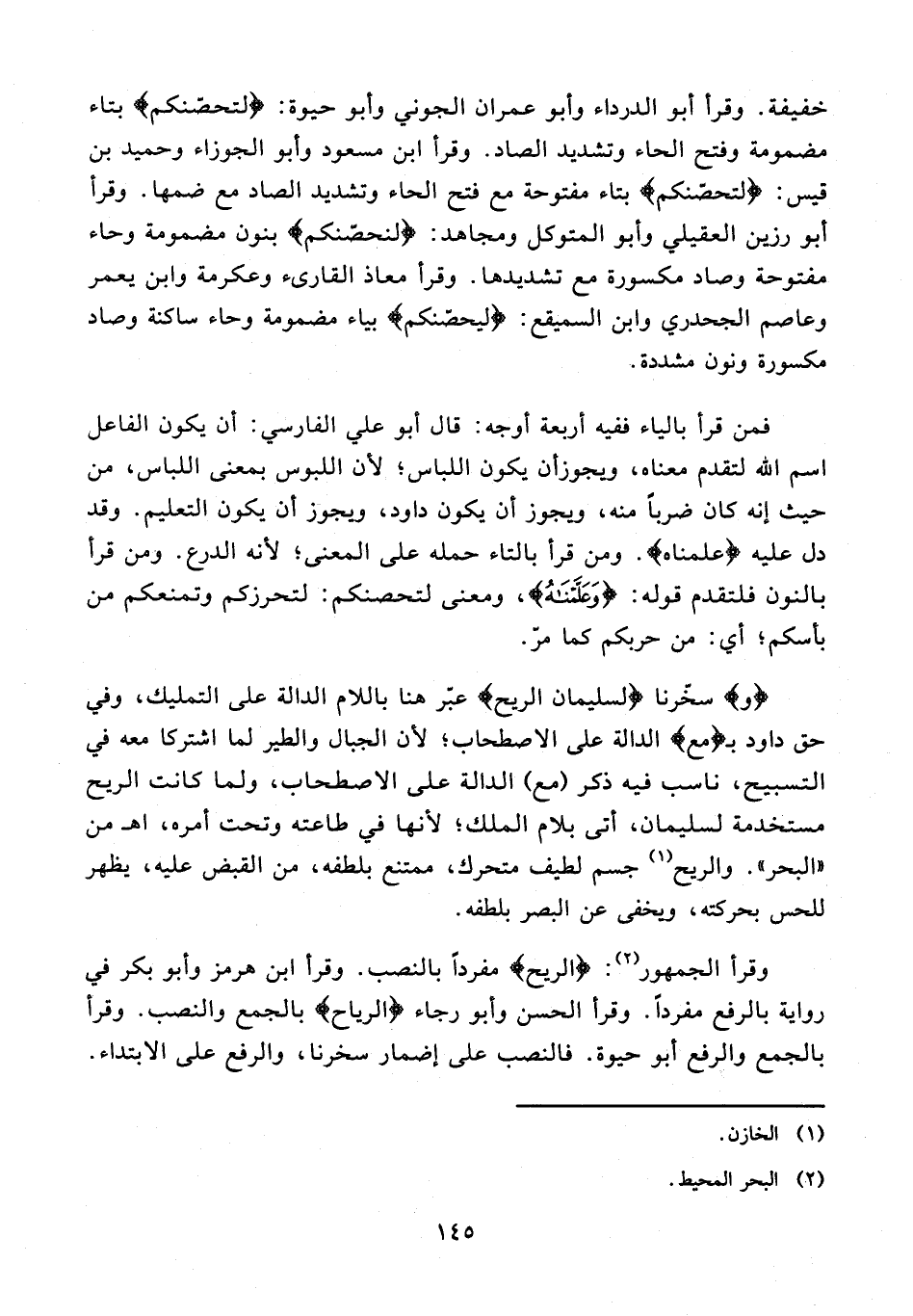 فمن قرأ بالياء ففيه أربعة أوجه: قال أبو علي الفارسي: أن يكون الفاعل اسم الله لتقدم معناه، ويجوز أن يكون اللباس؛ لأن اللبوس بمعنى اللباس، من حيث إنه كان ضربًا منه، ويجوز أن يكون داود، ويجوز أن يكون التعليم. وقد دل عليه {علمناه}. ومن قرأ بالتاء حمله على المعنى؛ لأنه الدرع. ومن قرأ بالنون فلتقدم قوله: {وَعَلَّمْنَاهُ}، ومعنى لتحصنكم: لتحرزكم وتمنعكم من بأسكم؛ أي: من حربكم كما مرّ.