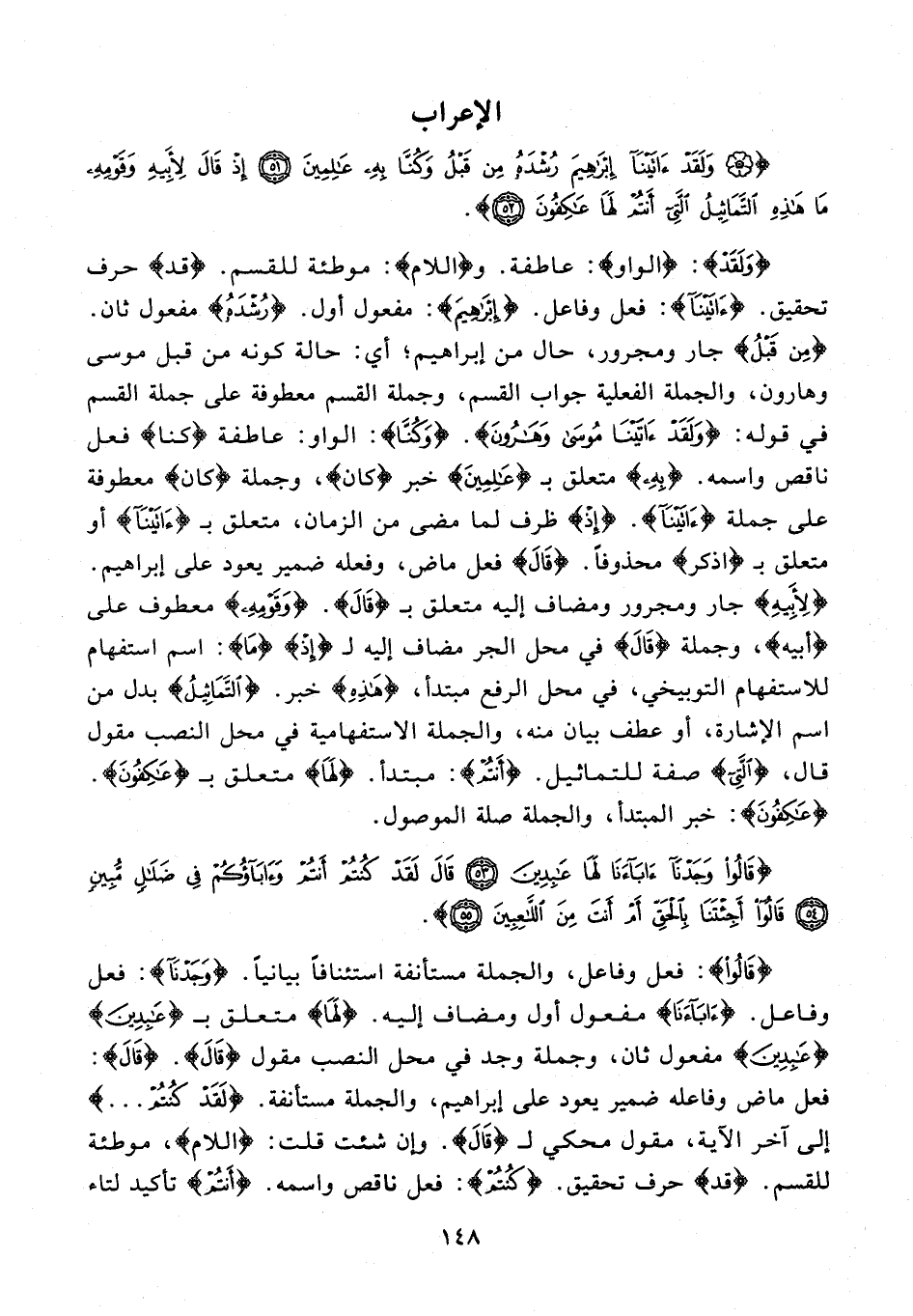 {وَلَقَدْ}: {الواو}: عاطفة. و {اللام}: موطئة للقسم. {قد} حرف تحقيق. {آتَيْنَا}: فعل وفاعل. {إِبْرَاهِيمَ}: مفعول أول. {رُشْدَهُ} مفعول ثان. {مِنْ قَبْلُ} جار ومجرور، حال من إبراهيم؛ أي: حالة كونه من قبل موسى وهارون، والجملة الفعلية جواب القسم، وجملة القسم معطوفة على جملة القسم في قوله: {وَلَقَدْ آتَيْنَا مُوسَى وَهَارُونَ}. {وَكُنَّا}: الواو: عاطفة {كنا} فعل ناقص واسمه. {بِهِ} متعلق بـ {عَالِمِينَ} خبر {كان}، وجملة {كان} معطوفة على جملة {آتَيْنَا}. {إِذْ} ظرف لما مضى من الزمان، متعلق بـ {آتَيْنَا} أو متعلق بـ {اذكر} محذوفًا. {قَالَ} فعل ماض، وفعله ضمير يعود على إبراهيم. {لِأَبِيهِ} جار ومجرور ومضاف إليه متعلق بـ {قَالَ}. {وَقَوْمِهِ} معطوف على {أبيه}، وجملة {قَالَ} في محل الجر مضاف إليه لـ {إِذْ} {مَا}: اسم استفهام للاستفهام التوبيخي، في محل الرفع مبتدأ، {هَذِهِ} خبر. {التَّمَاثِيلُ} بدل من اسم الإشارة، أو عطف بيان منه، والجملة الاستفهامية في محل النصب مقول قال، {الَّتِي} صفة للتماثيل. {أَنْتُمْ}: مبتدأ. {لَهَا} متعلق بـ {عَاكِفُونَ}. {عَاكِفُونَ}: خبر المبتدأ، والجملة صلة الموصول.