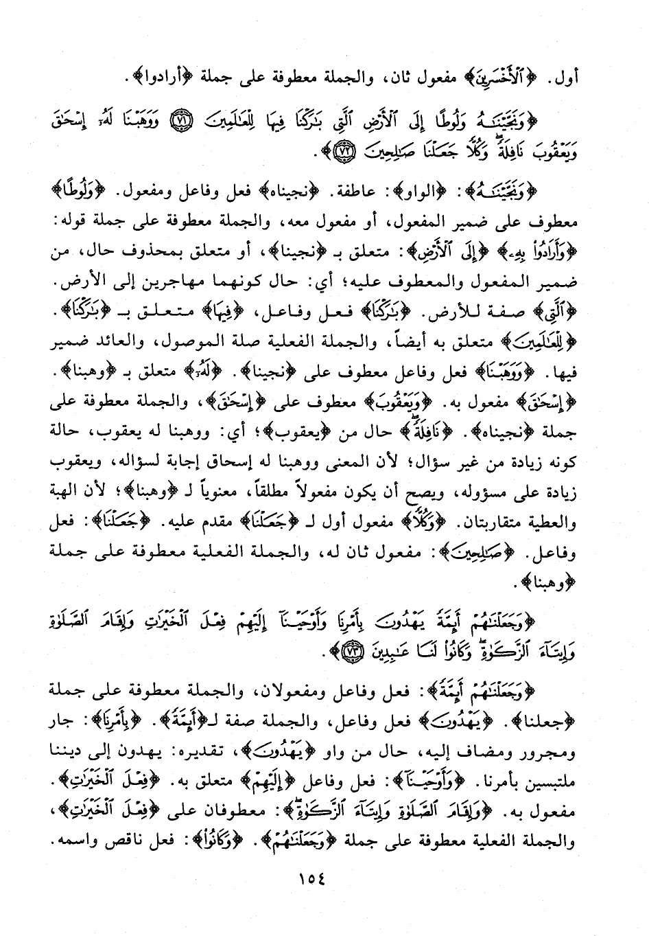{وَجَعَلْنَاهُمْ أَئِمَّةً} فعل وفاعل ومفعولان، والجملة معطوفة على جملة {جعلنا}. {يَهْدُونَ} فعل وفاعل، والجملة صفة لـ {أَئِمَّةً}. {بِأَمْرِنَا}: جار ومجرور ومضاف إليه، حال من واو {يَهْدُونَ}، تقديره: يهدون إلى ديننا ملتبسين بأمرنا. {وَأَوْحَيْنَا}: فعل وفاعل {إِلَيْهِمْ} متعلق به. {فِعْلَ الْخَيْرَاتِ}. مفعول به. {وَإِقَامَ الصَّلَاةِ وَإِيتَاءَ الزَّكَاةِ}: معطوفان على {فِعْلَ الْخَيْرَاتِ}، والجملة الفعلية معطوفة على جملة {وَجَعَلْنَاهُمْ}. {وَكَانُوا}: فعل ناقص واسمه.