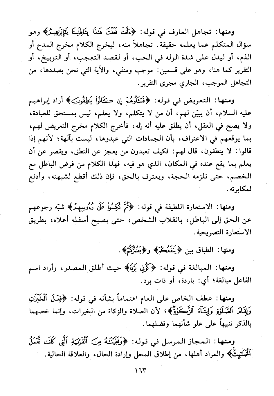 ومنها: التعريض في قوله: {فَاسْأَلُوهُمْ إِنْ كَانُوا يَنْطِقُونَ} أراد إبراهيم عليه السلام، أن يبيّن لهم، أن من لا يتكلم، ولا يعلم، ليس بمستحق للعبادة، ولا يصح في العقل، أن يطلق عليه أنه إله، فأخرج الكلام مخرج التعريض لهم، بما يوقعهم في الاعتراف، بأن الجمادات التي عبدوها، ليست بآلهة؛ لأنهم إذا قالوا: لا ينطقون، قال لهم: فكيف تعبدون من يعجز عن النطق، ويقصر عن أن يعلم بما يقع عنده في المكان، الذي هو فيه، فهذا الكلام من فرض الباطل مع الخصم، حتى تلزمه الحجة، ويعترف بالحق، فإن ذلك أقطع لشبهته، وأدفع لمكابرته.
