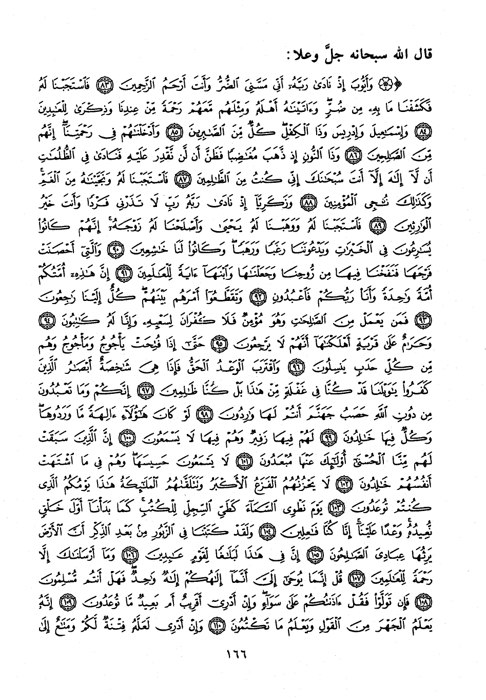 {وَأَيُّوبَ إِذْ نَادَى رَبَّهُ أَنِّي مَسَّنِيَ الضُّرُّ وَأَنْتَ أَرْحَمُ الرَّاحِمِينَ (83) فَاسْتَجَبْنَا لَهُ فَكَشَفْنَا مَا بِهِ مِنْ ضُرٍّ وَآتَيْنَاهُ أَهْلَهُ وَمِثْلَهُمْ مَعَهُمْ رَحْمَةً مِنْ عِنْدِنَا وَذِكْرَى لِلْعَابِدِينَ (84) وَإِسْمَاعِيلَ وَإِدْرِيسَ وَذَا الْكِفْلِ كُلٌّ مِنَ الصَّابِرِينَ (85) وَأَدْخَلْنَاهُمْ فِي رَحْمَتِنَا إِنَّهُمْ مِنَ الصَّالِحِينَ (86) وَذَا النُّونِ إِذْ ذَهَبَ مُغَاضِبًا فَظَنَّ أَنْ لَنْ نَقْدِرَ عَلَيْهِ فَنَادَى فِي الظُّلُمَاتِ أَنْ لَا إِلَهَ إِلَّا أَنْتَ سُبْحَانَكَ إِنِّي كُنْتُ مِنَ الظَّالِمِينَ (87) فَاسْتَجَبْنَا لَهُ وَنَجَّيْنَاهُ مِنَ الْغَمِّ وَكَذَلِكَ نُنْجِي الْمُؤْمِنِينَ (88) وَزَكَرِيَّا إِذْ نَادَى رَبَّهُ رَبِّ لَا تَذَرْنِي فَرْدًا وَأَنْتَ خَيْرُ الْوَارِثِينَ (89) فَاسْتَجَبْنَا لَهُ وَوَهَبْنَا لَهُ يَحْيَى وَأَصْلَحْنَا لَهُ زَوْجَهُ إِنَّهُمْ كَانُوا يُسَارِعُونَ فِي الْخَيْرَاتِ وَيَدْعُونَنَا رَغَبًا وَرَهَبًا وَكَانُوا لَنَا خَاشِعِينَ (90) وَالَّتِي أَحْصَنَتْ فَرْجَهَا فَنَفَخْنَا فِيهَا مِنْ رُوحِنَا وَجَعَلْنَاهَا وَابْنَهَا آيَةً لِلْعَالَمِينَ (91) إِنَّ هَذِهِ أُمَّتُكُمْ أُمَّةً وَاحِدَةً وَأَنَا رَبُّكُمْ فَاعْبُدُونِ (92) وَتَقَطَّعُوا أَمْرَهُمْ بَيْنَهُمْ كُلٌّ إِلَيْنَا رَاجِعُونَ (93) فَمَنْ يَعْمَلْ مِنَ الصَّالِحَاتِ وَهُوَ مُؤْمِنٌ فَلَا كُفْرَانَ لِسَعْيِهِ وَإِنَّا لَهُ كَاتِبُونَ (94) وَحَرَامٌ عَلَى قَرْيَةٍ أَهْلَكْنَاهَا أَنَّهُمْ لَا يَرْجِعُونَ (95) حَتَّى إِذَا فُتِحَتْ يَأْجُوجُ وَمَأْجُوجُ وَهُمْ مِنْ كُلِّ حَدَبٍ يَنْسِلُونَ (96) وَاقْتَرَبَ الْوَعْدُ الْحَقُّ فَإِذَا هِيَ شَاخِصَةٌ أَبْصَارُ الَّذِينَ كَفَرُوا يَا وَيْلَنَا قَدْ كُنَّا فِي غَفْلَةٍ مِنْ هَذَا بَلْ كُنَّا ظَالِمِينَ (97) إِنَّكُمْ وَمَا تَعْبُدُونَ مِنْ دُونِ اللَّهِ حَصَبُ جَهَنَّمَ أَنْتُمْ لَهَا وَارِدُونَ (98) لَوْ كَانَ هَؤُلَاءِ آلِهَةً مَا وَرَدُوهَا وَكُلٌّ فِيهَا خَالِدُونَ (99) لَهُمْ فِيهَا زَفِيرٌ وَهُمْ فِيهَا لَا يَسْمَعُونَ (100) إِنَّ الَّذِينَ سَبَقَتْ لَهُمْ مِنَّا الْحُسْنَى أُولَئِكَ عَنْهَا مُبْعَدُونَ (101) لَا يَسْمَعُونَ حَسِيسَهَا وَهُمْ فِي مَا اشْتَهَتْ أَنْفُسُهُمْ خَالِدُونَ (102) لَا يَحْزُنُهُمُ الْفَزَعُ الْأَكْبَرُ وَتَتَلَقَّاهُمُ الْمَلَائِكَةُ هَذَا يَوْمُكُمُ الَّذِي كُنْتُمْ تُوعَدُونَ (103) يَوْمَ نَطْوِي السَّمَاءَ كَطَيِّ السِّجِلِّ لِلْكُتُبِ كَمَا بَدَأْنَا أَوَّلَ خَلْقٍ نُعِيدُهُ وَعْدًا عَلَيْنَا إِنَّا كُنَّا فَاعِلِينَ (104) وَلَقَدْ كَتَبْنَا فِي الزَّبُورِ مِنْ بَعْدِ الذِّكْرِ أَنَّ الْأَرْضَ يَرِثُهَا عِبَادِيَ الصَّالِحُونَ (105) إِنَّ فِي هَذَا لَبَلَاغًا لِقَوْمٍ عَابِدِينَ (106) وَمَا أَرْسَلْنَاكَ إِلَّا رَحْمَةً لِلْعَالَمِينَ (107) قُلْ إِنَّمَا يُوحَى إِلَيَّ أَنَّمَا إِلَهُكُمْ إِلَهٌ وَاحِدٌ فَهَلْ أَنْتُمْ مُسْلِمُونَ (108) فَإِنْ تَوَلَّوْا فَقُلْ آذَنْتُكُمْ عَلَى سَوَاءٍ وَإِنْ أَدْرِي أَقَرِيبٌ أَمْ بَعِيدٌ مَا تُوعَدُونَ (109) إِنَّهُ يَعْلَمُ الْجَهْرَ مِنَ الْقَوْلِ وَيَعْلَمُ مَا تَكْتُمُونَ (110) وَإِنْ أَدْرِي لَعَلَّهُ فِتْنَةٌ لَكُمْ وَمَتَاعٌ إِلَى