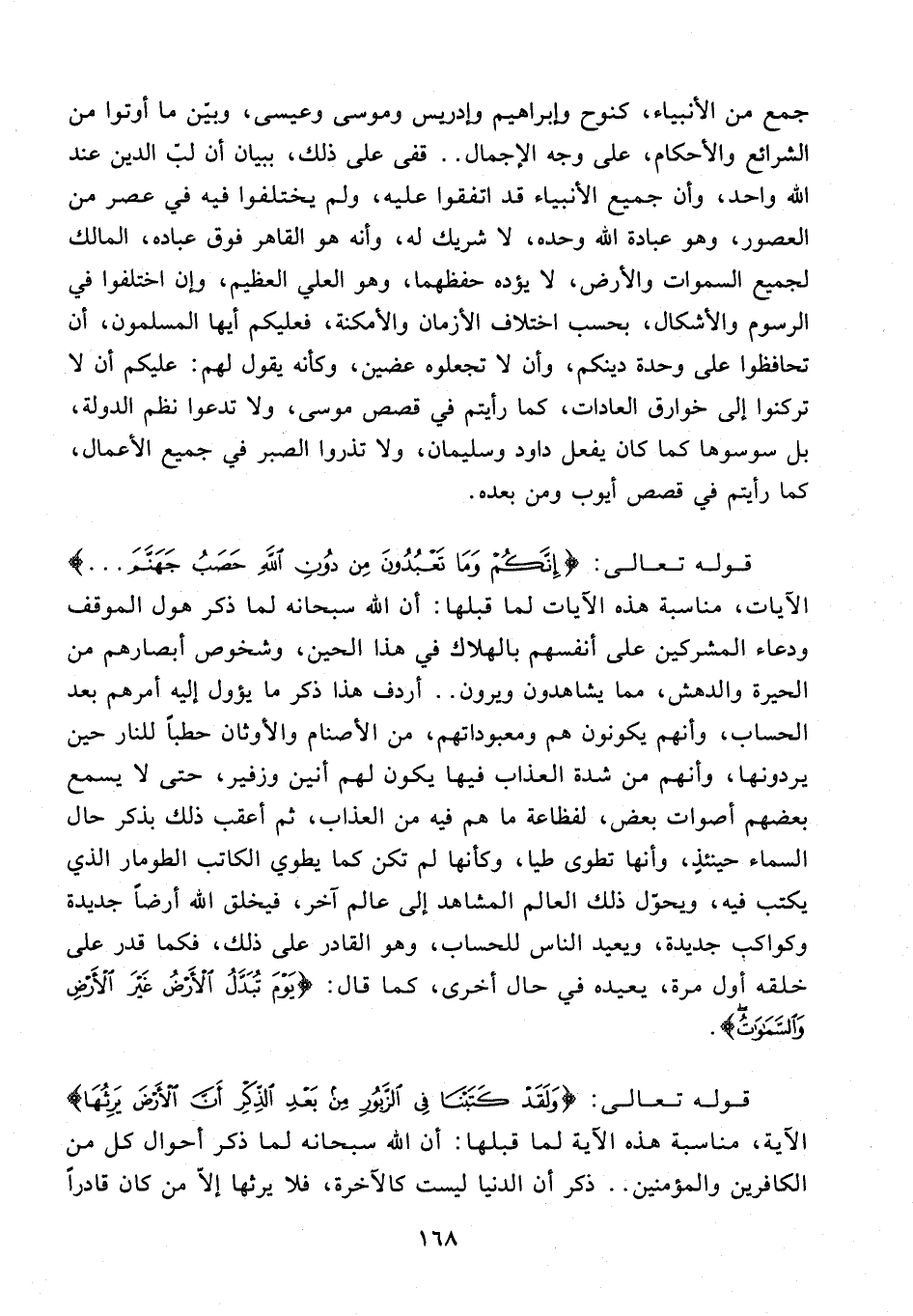 قوله تعالى: {إِنَّكُمْ وَمَا تَعْبُدُونَ مِنْ دُونِ اللَّهِ حَصَبُ جَهَنَّمَ ...} الآيات، مناسبة هذه الآيات لما قبلها: أن الله سبحانه لما ذكر هول الموقف ودعاء المشركين على أنفسهم بالهلاك في هذا الحين، وشخوص أبصارهم من الحيرة والدهش، مما يشاهدون ويرون .. أردف هذا ذكر ما يؤول إليه أمرهم بعد الحساب، وأنهم يكونون هم ومعبوداتهم، من الأصنام والأوثان حطبًا للنار حين يردونها، وأنهم من شدة العذاب فيها يكون لهم أنين وزفير، حتى لا يسمع بعضهم أصوات بعض، لفظاعة ما هم فيه من العذاب، ثم أعقب ذلك بذكر حال السماء حينئذٍ، وأنها تطوى طيا، وكأنها لم تكن كما يطوي الكاتب الطومار الذي يكتب فيه، ويحوّل ذلك العالم المشاهد إلى عالم آخر، فيخلق الله أرضًا جديدة وكواكب جديدة، ويعيد الناس للحساب، وهو القادر على ذلك، فكما قدر على خلقه أول مرة، يعيده في حال أخرى، كما قال: {يَوْمَ تُبَدَّلُ الْأَرْضُ غَيْرَ الْأَرْضِ وَالسَّمَاوَاتُ}.