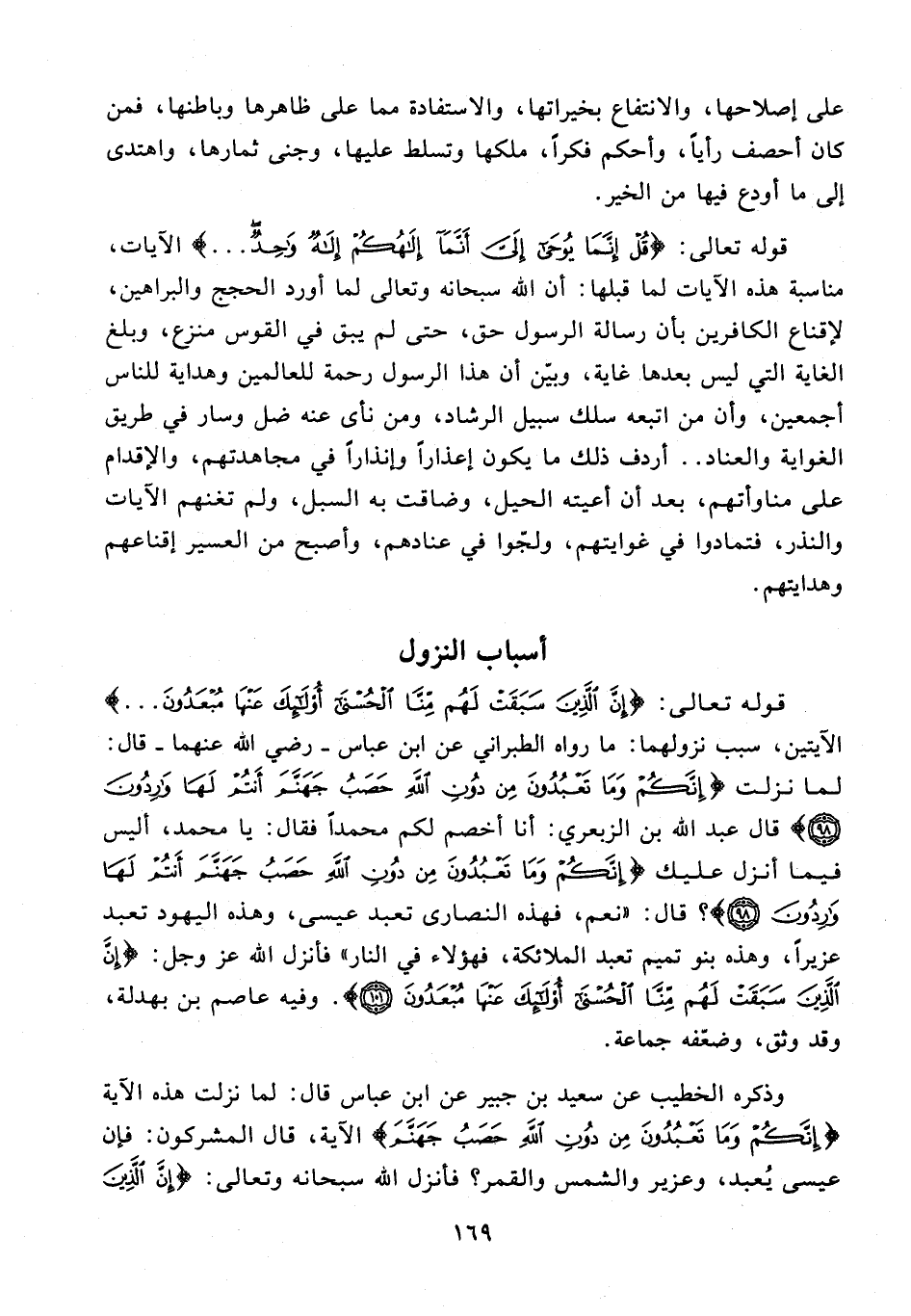 وذكره الخطيب عن سعيد بن جبير عن ابن عباس قال: لما نزلت هذه الآية {إِنَّكُمْ وَمَا تَعْبُدُونَ مِنْ دُونِ اللَّهِ حَصَبُ جَهَنَّمَ} الآية، قال المشركون: فإن عيسى يُعبد، وعزير والشمس والقمر؟ فأنزل الله سبحانه وتعالى: {إِنَّ الَّذِينَ