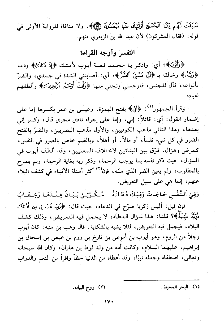 83 - {وَأَيُّوبَ}؛ أي: واذكر يا محمد قصة أيوب لأمتك {إِذْ نَادَى} ودعا {رَبَّهُ} وخالقه بـ {أَنِّي مَسَّنِيَ الضُّرُّ}؛ أي: أصابتني الشدة في جسدي، والضرّ بأنواعه، فأل للجنس، فارحمني ونجني منها {وَأَنْتَ أَرْحَمُ الرَّاحِمِينَ} وألطفهم لعباده.