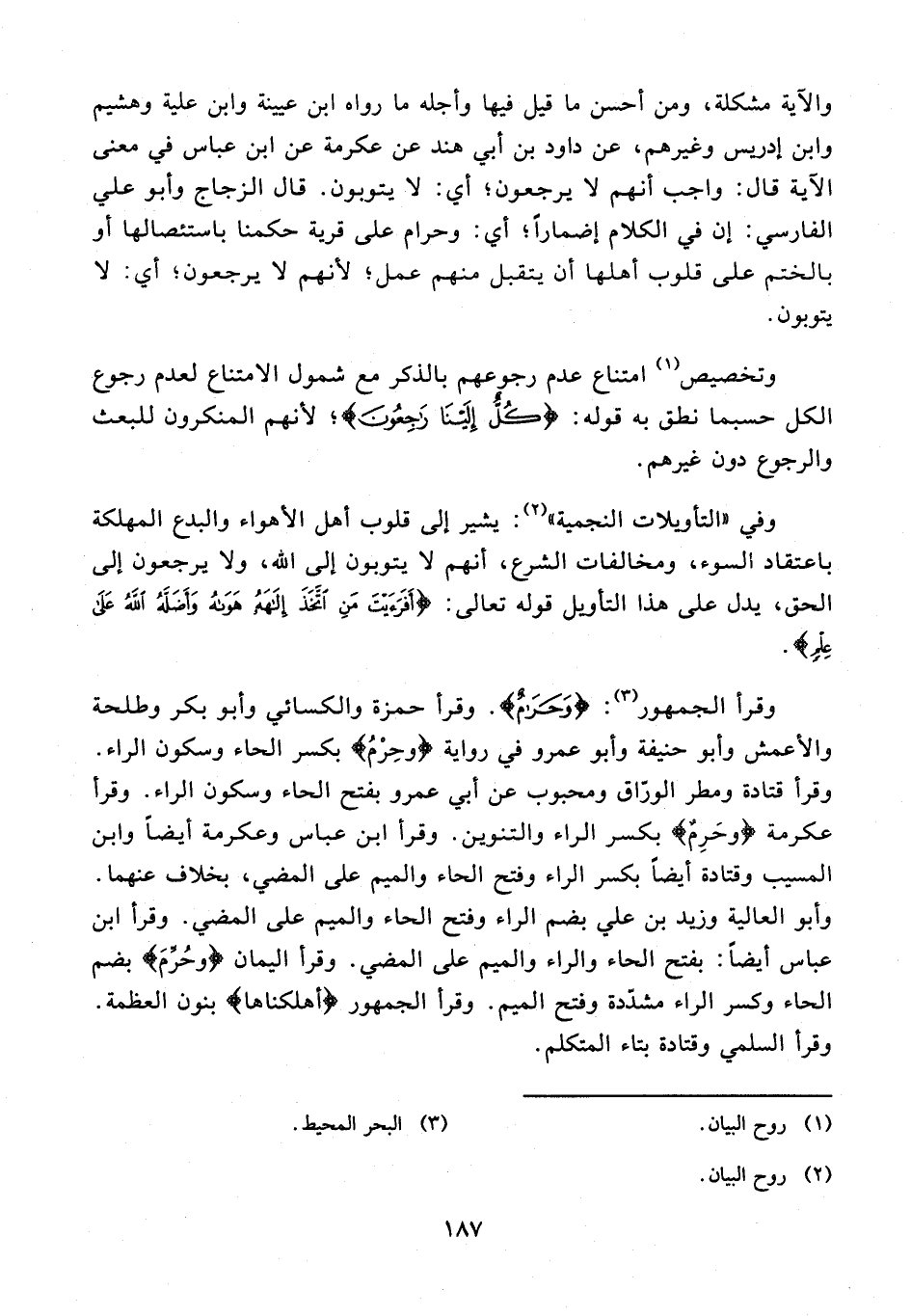 والآية مشكلة، ومن أحسن ما قيل فيها وأجله ما رواه ابن عيينة وابن علية وهشيم وابن إدريس وغيرهم، عن داود بن أبي هند عن عكرمة عن ابن عباس في معنى الآية قال: واجب أنهم لا يرجعون؛ أي: لا يتوبون. قال الزجاج وأبو علي الفارسي: إن في الكلام إضماراً؛ أي: وحرام على قرية حكمنا باستئصالها أو بالختم على قلوب أهلها أن يتقبل منهم عمل؛ لأنهم لا يرجعون؛ أي: لا يتوبون.