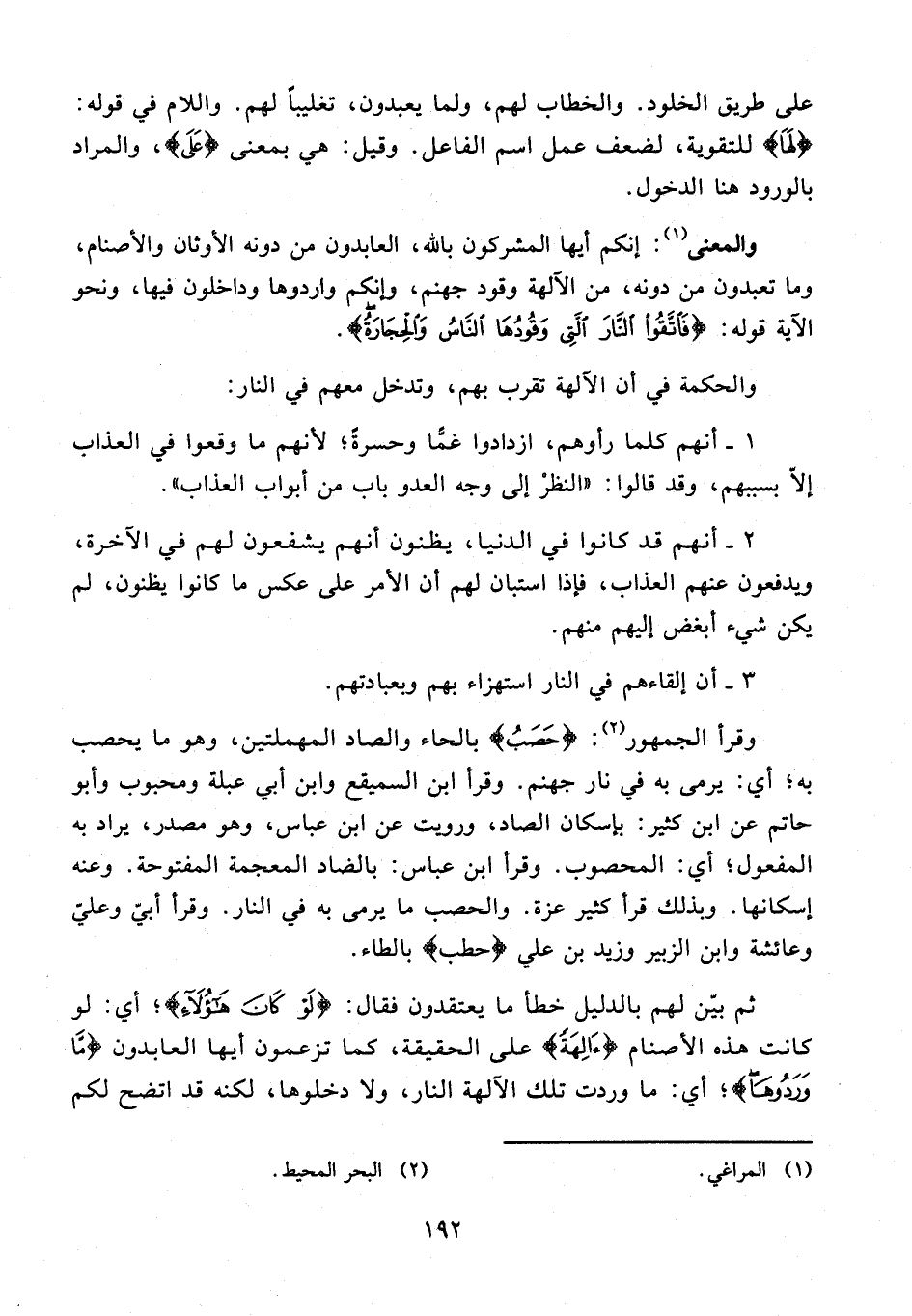 وقرأ الجمهور (¬2): {حَصَبُ} بالحاء والصاد المهملتين، وهو ما يحصب به؛ أي: يرمى به في نار جهنم. وقرأ ابن السميقع وابن أبي عبلة ومحبوب وأبو حاتم عن ابن كثير: بإسكان الصاد، ورويت عن ابن عباس، وهو مصدر، يراد به المفعول؛ أي: المحصوب. وقرأ ابن عباس: بالضاد المعجمة المفتوحة. وعنه إسكانها. وبذلك قرأ كثير عزة. والحصب ما يرمى به في النار. وقرأ أبيّ وعليّ وعائشة وابن الزبير وزيد بن علي {حطب} بالطاء.