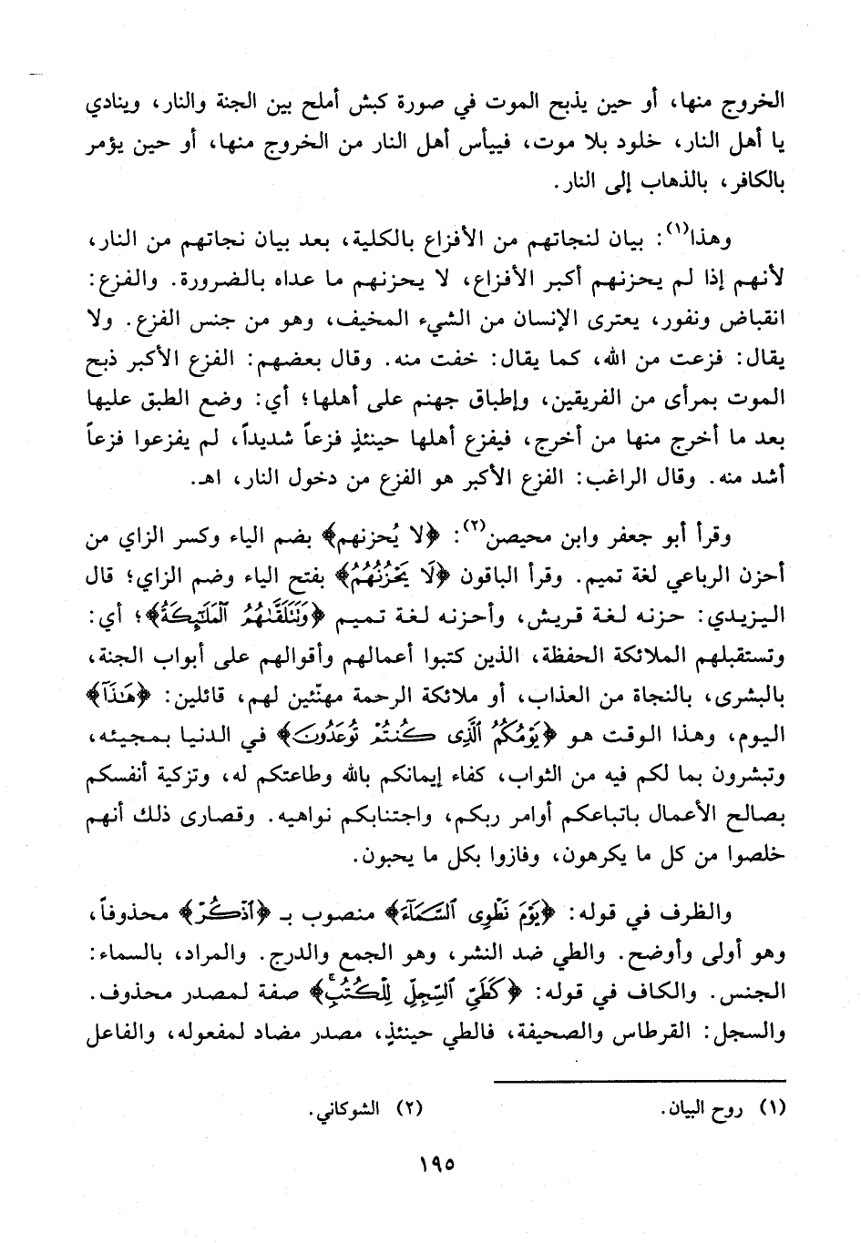 104 - والظرف في قوله: {يَوْمَ نَطْوِي السَّمَاءَ} منصوب بـ {اذْكُرْ} محذوفًا، وهو أولى وأوضح. والطي ضد النشر، وهو الجمع والدرج. والمراد، بالسماء: الجنس. والكاف في قوله: {كَطَيِّ السِّجِلِّ لِلْكُتُبِ} صفة لمصدر محذوف. والسجل: القرطاس والصحيفة، فالطي حينئذٍ، مصدر مضاد لمفعوله، والفاعل