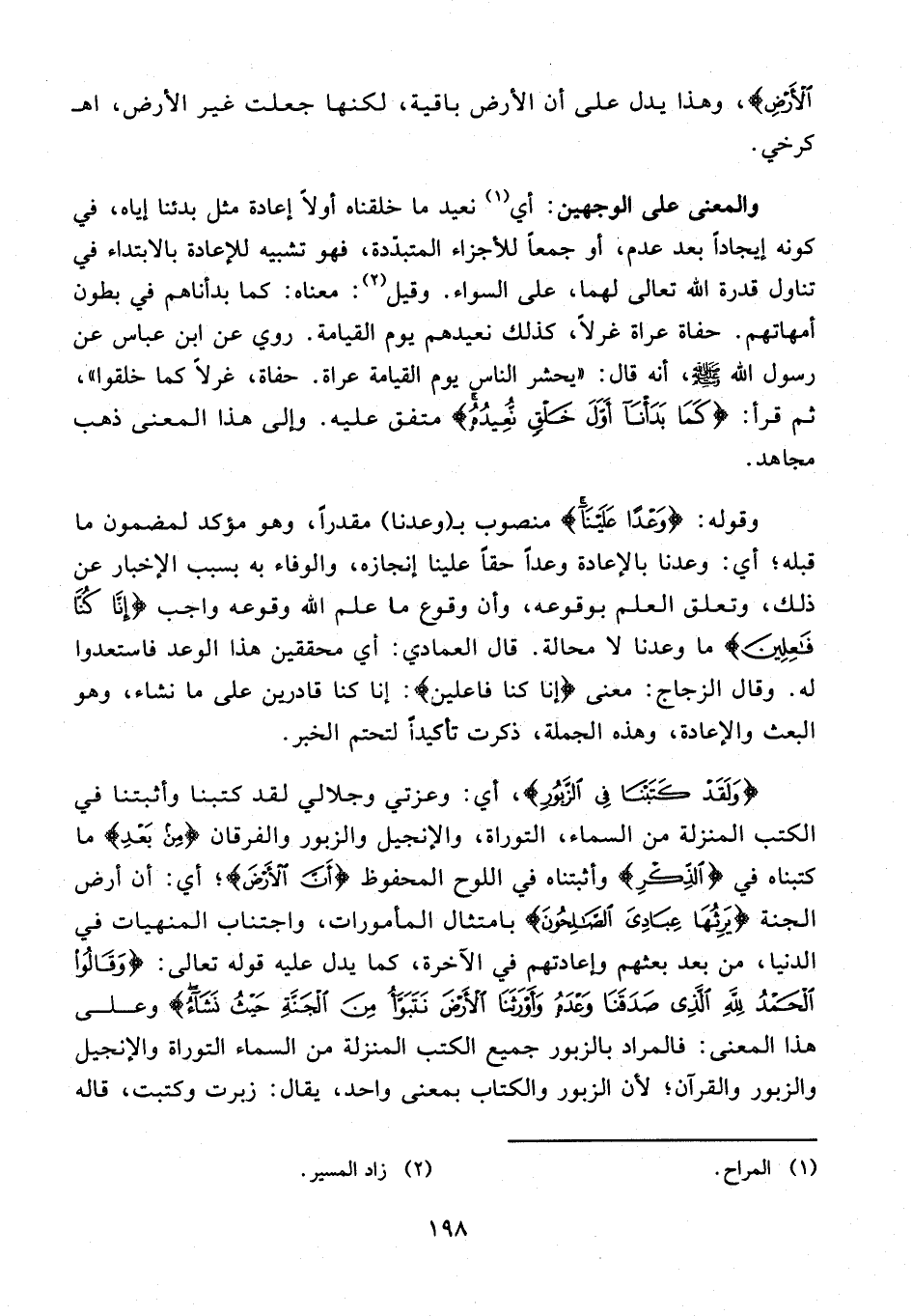 والمعنى على الوجهين: أي (¬1) نعيد ما خلقناه أولًا إعادة مثل بدئنا إياه، في كونه إيجادًا بعد عدم، أو جمعًا للأجزاء المتبدّدة، فهو تشبيه للإعادة بالابتداء في تناول قدرة الله تعالى لهما، على السواء. وقيل (¬2): معناه: كما بدأناهم في بطون أمهاتهم. حفاة عراة غرلًا، كذلك نعيدهم يوم القيامة. روي عن ابن عباس عن رسول الله - صلى الله عليه وسلم -، أنه قال: "يحشر الناس يوم القيامة عراة. حفاة، غرلًا كما خلقوا"، ثم قرأ: {كَمَا بَدَأْنَا أَوَّلَ خَلْقٍ نُعِيدُهُ} متفق عليه. وإلى هذا المعنى ذهب مجاهد.