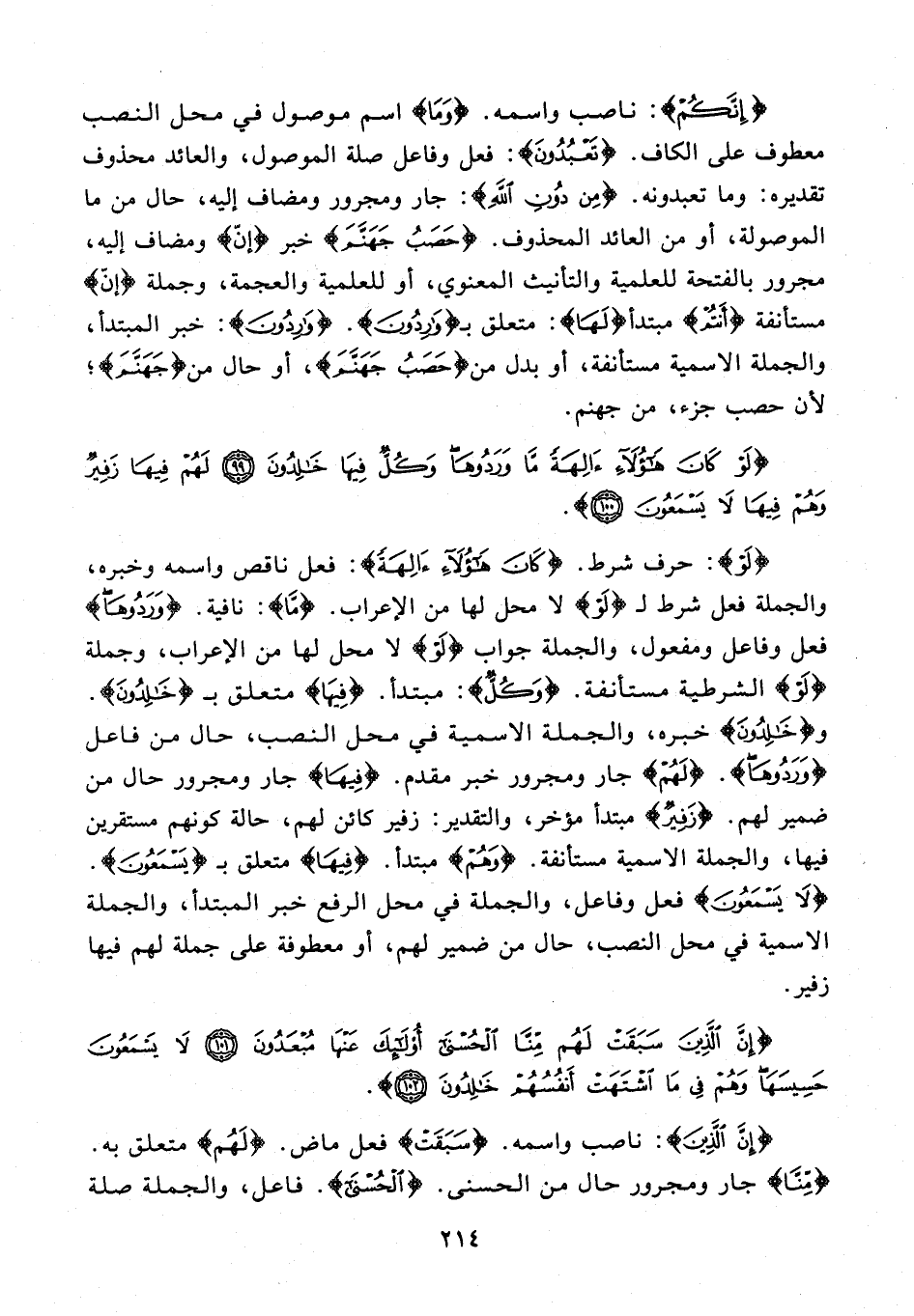 {لَوْ}: حرف شرط. {كَانَ هَؤُلَاءِ آلِهَةً}: فعل ناقص واسمه وخبره، والجملة فعل شرط لـ {لَوْ} لا محل لها من الإعراب. {مَا}: نافية. {وَرَدُوهَا} فعل وفاعل ومفعول، والجملة جواب {لَوْ} لا محل لها من الإعراب، وجملة {لَوْ} الشرطية مستأنفة. {وَكُلٌّ}: مبتدأ. {فِيهَا} متعلق بـ {خَالِدُونَ}. و {خَالِدُونَ} خبره، والجملة الاسمية في محل النصب، حال من فاعل {وَرَدُوهَا}. {لَهُمْ} جار ومجرور خبر مقدم. {فِيهَا} جار ومجرور حال من ضمير لهم. {زَفِيرٌ} مبتدأ مؤخر، والتقدير: زفير كائن لهم، حالة كونهم مستقرين فيها، والجملة الاسمية مستأنفة. {وَهُمْ} مبتدأ. {فِيهَا} متعلق بـ {يَسْمَعُونَ}. {لَا يَسْمَعُونَ} فعل وفاعل، والجملة في محل الرفع خبر المبتدأ، والجملة الاسمية في محل النصب، حال من ضمير لهم، أو معطوفة على جملة لهم فيها زفير.