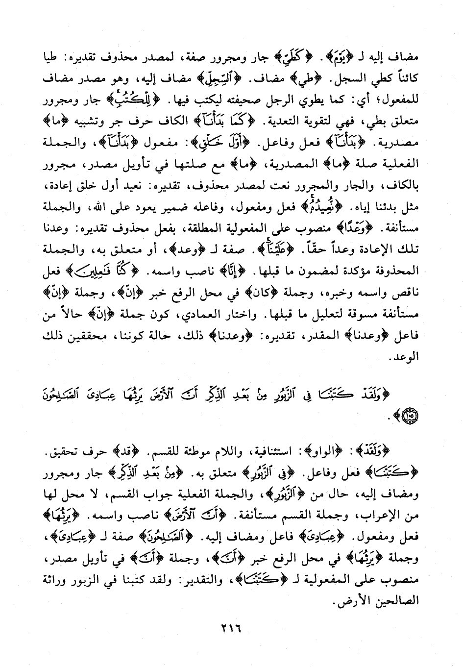 {وَلَقَدْ}: {الواو}: استئنافية، واللام موطئة للقسم. {قد} حرف تحقيق. {كَتَبْنَا} فعل وفاعل. {فِي الزَّبُورِ} متعلق به. {مِنْ بَعْدِ الذِّكْرِ} جار ومجرور ومضاف إليه، حال من {الزَّبُورِ}، والجملة الفعلية جواب القسم، لا محل لها من الإعراب، وجملة القسم مستأنفة. {أَنَّ الْأَرْضَ} ناصب واسمه. {يَرِثُهَا} فعل ومفعول. {عِبَادِيَ} فاعل ومضاف إليه. {الصَّالِحُونَ} صفة لـ {عِبَادِيَ}، وجملة {يَرِثُهَا} في محل الرفع خبر {أَنَّ}، وجملة {أَنَّ} في تأويل مصدر، منصوب على المفعولية لـ {كَتَبْنَا}، والتقدير: ولقد كتبنا في الزبور وراثة الصالحين الأرض.