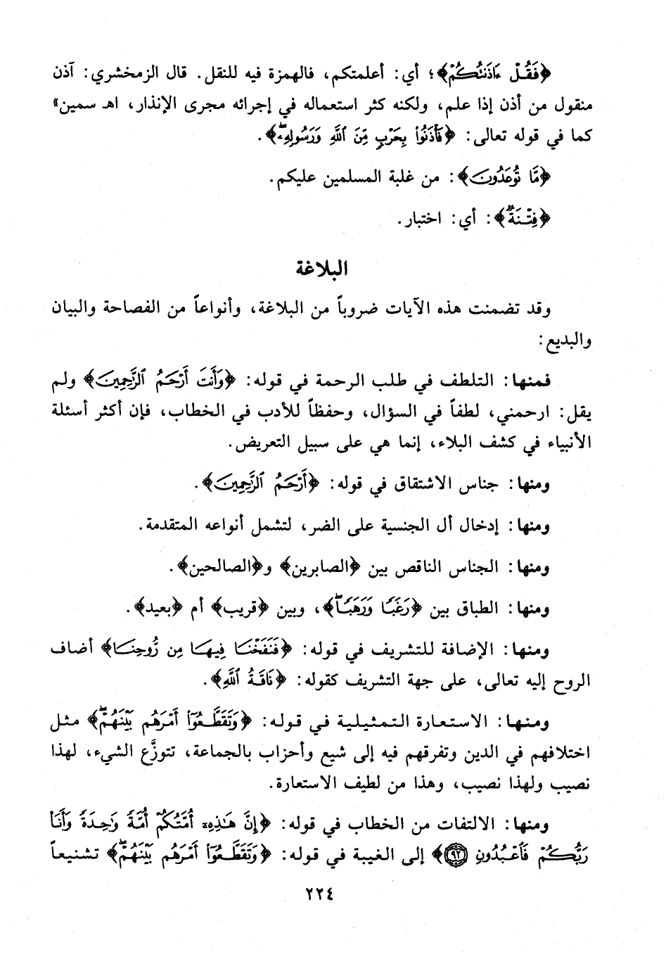 وقد تضمنت هذه الآيات ضروبًا من البلاغة، وأنواعًا من الفصاحة والبيان والبديع: