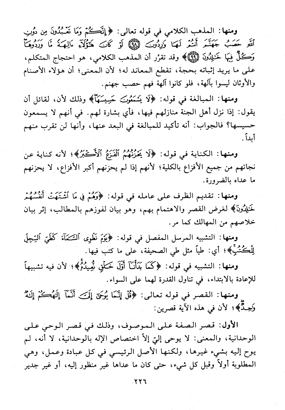 ومنها: القصر في قوله تعالى: {قُلْ إِنَّمَا يُوحَى إِلَيَّ أَنَّمَا إِلَهُكُمْ إِلَهٌ وَاحِدٌ}؛ لأن في هذه الآية قصرين: