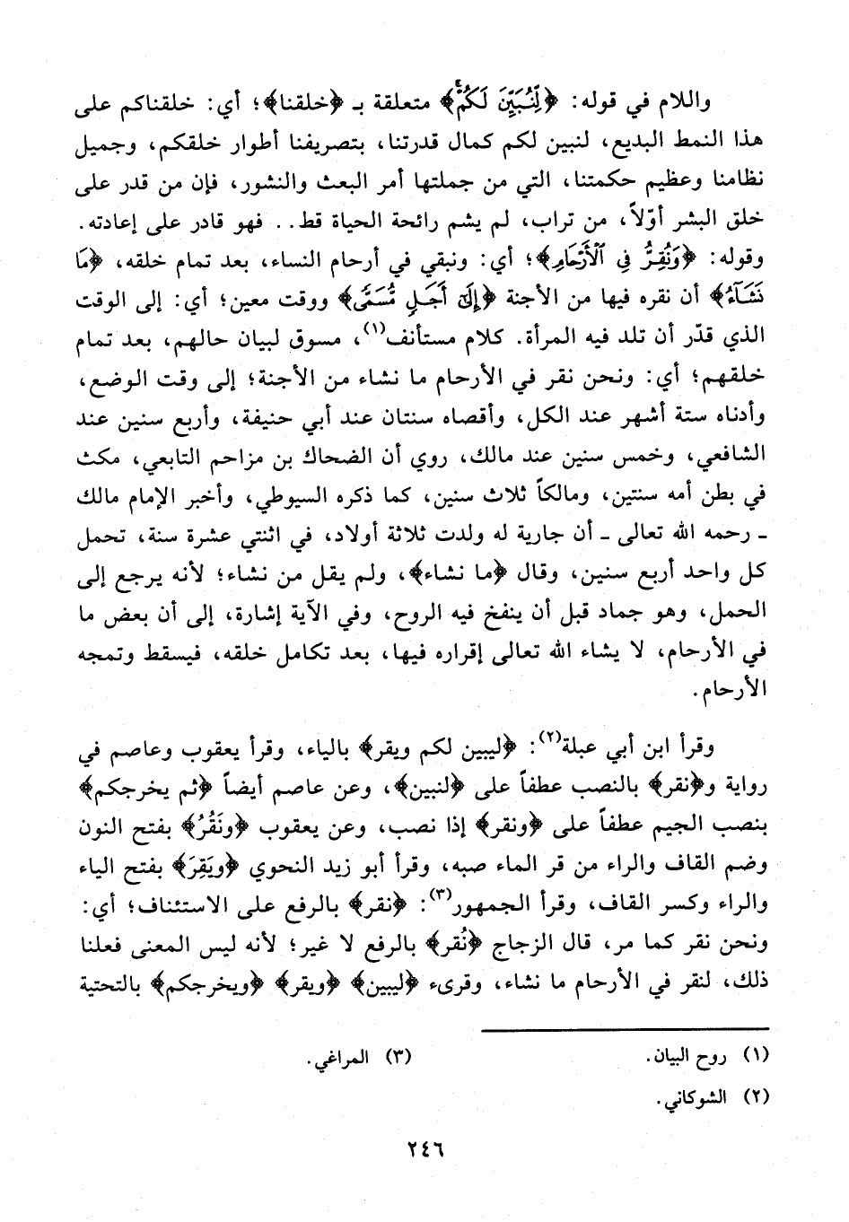 وقرأ ابن أبي عبلة (¬2): {ليبين لكم ويقر} بالياء، وقرأ يعقوب وعاصم في رواية و {نقر} بالنصب عطفًا على {لنبين}، وعن عاصم أيضًا {ثم يخرجكم} بنصب الجيم عطفًا على {ونقر} إذا نصب، وعن يعقوب {وَنُقِرُّ} بفتح النون وضم القاف والراء من قر الماء صبه، وقرأ أبو زيد النحوي {ويَقِرَ} بفتح الياء والراء وكسر القاف، وقرأ الجمهور (¬3): {نقر} بالرفع على الاستئناف؛ أي: ونحن نقر كما مر، قال الزجاج {نُقر} بالرفع لا غير؛ لأنه ليس المعنى فعلنا ذلك، لنقر في الأرحام ما نشاء، وقرىء {ليبين} {ويقر} {ويخرجكم} بالتحتية