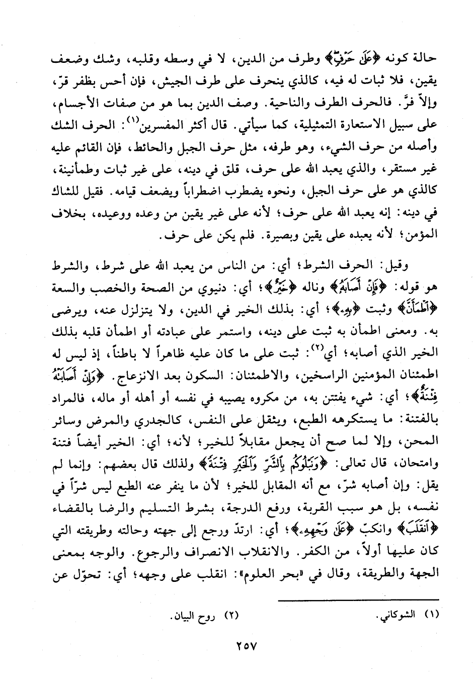 حالة كونه {عَلَى حَرْفٍ} وطرف من الدين، لا في وسطه وقلبه، وشك وضعف يقين، فلا ثبات له فيه، كالذي ينحرف على طرف الجيش، فإن أحس بظفر قرّ، وإلّا فرَّ. فالحرف الطرف والناحية. وصف الدين بما هو من صفات الأجسام، على سبيل الاستعارة التمثيلية، كما سيأتي. قال أكثر المفسرين (¬1): الحرف الشك وأصله من حرف الشيء، وهو طرفه، مثل حرف الجبل والحائط، فإن القائم عليه غير مستقر، والذي يعبد الله على حرف، قلق في دينه، على غير ثبات وطمأنينة، كالذي هو على حرف الجبل، ونحوه يضطرب اضطرابًا ويضعف قيامه. فقيل للشاك في دينه: إنه يعبد الله على حرف؛ لأنه على غير يقين من وعده ووعيده، بخلاف المؤمن؛ لأنه يعبده على يقين وبصيرة. فلم يكن على حرف.