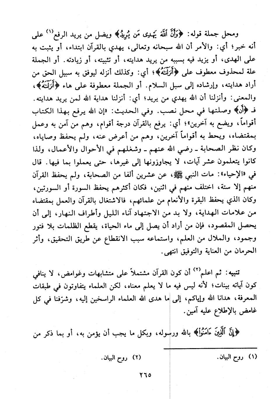 ومحل جملة قوله: {وَأَنَّ اللَّهَ يَهْدِي مَنْ يُرِيدُ} ويضل من يريد الرفع (¬1) على أنه خبر؛ أي: والأمر أن الله سبحانه وتعالى، يهدي بالقرآن ابتداء، أو يثبت به على الهدى، أو يزيد فيه بسببه من يريد هدايته، أو تثبيته، أو زيادته. أو الجملة علة لمحذوف معطوف على {أَنْزَلْنَاهُ}؛ أي: وكذلك أنزله ليوفق به سبيل الحق من أراد هدايته، وإرشاده إلى سبل السلام. أو الجملة معطوفة على هاء {أَنْزَلْنَاهُ}، والمعنى: وأنزلنا أن الله يهدي من يريد؛ أي: أنزلنا هداية الله لمن يريد هدايته. فـ {أَن} وصلتها في محل نصب. وفي الحديث: "إن الله يرفع بهذا الكتاب أقوامًا، ويضع به آخرين"؛ أي: يرفع بالقرآن درجة أقوام، وهم من آمن به وعمل بمقتضاه، ويحط به أقوامًا آخرين، وهم من أعرض عنه، ولم يحفظ وصاياه، وكان نظر الصحابة - رضي الله عنهم - وشغلهم في الأحوال والأعمال، ولذا كانوا يتعلمون عشر آيات، لا يجاوزونها إلى غيرها، حتى يعملوا بما فيها. قال في "الإحياء": مات النبي - صلى الله عليه وسلم -، عن عشرين ألفا من الصحابة، ولم يحفظ القرآن منهم إلا ستة، اختلف منهم في اثنين، فكان أكثرهم يحفظ السورة أو السورتين، وكان الذي يحفظ البقرة والأنعام من علمائهم، فالاشتغال بالقرآن والعمل بمقتضاه من علامات الهداية، ولا بد من الاجتهاد آناء الليل وأطراف النهار، إلى أن يحصل المقصود، فإن من أراد أن يصل إلى ماء الحياة، يقطع الظلمات بلا فتور وجمود، والملال من العلم، واستماعه سبب الانقطاع عن طريق التحقيق، وأثر الحرمان من العناية والتوفيق انتهى.
