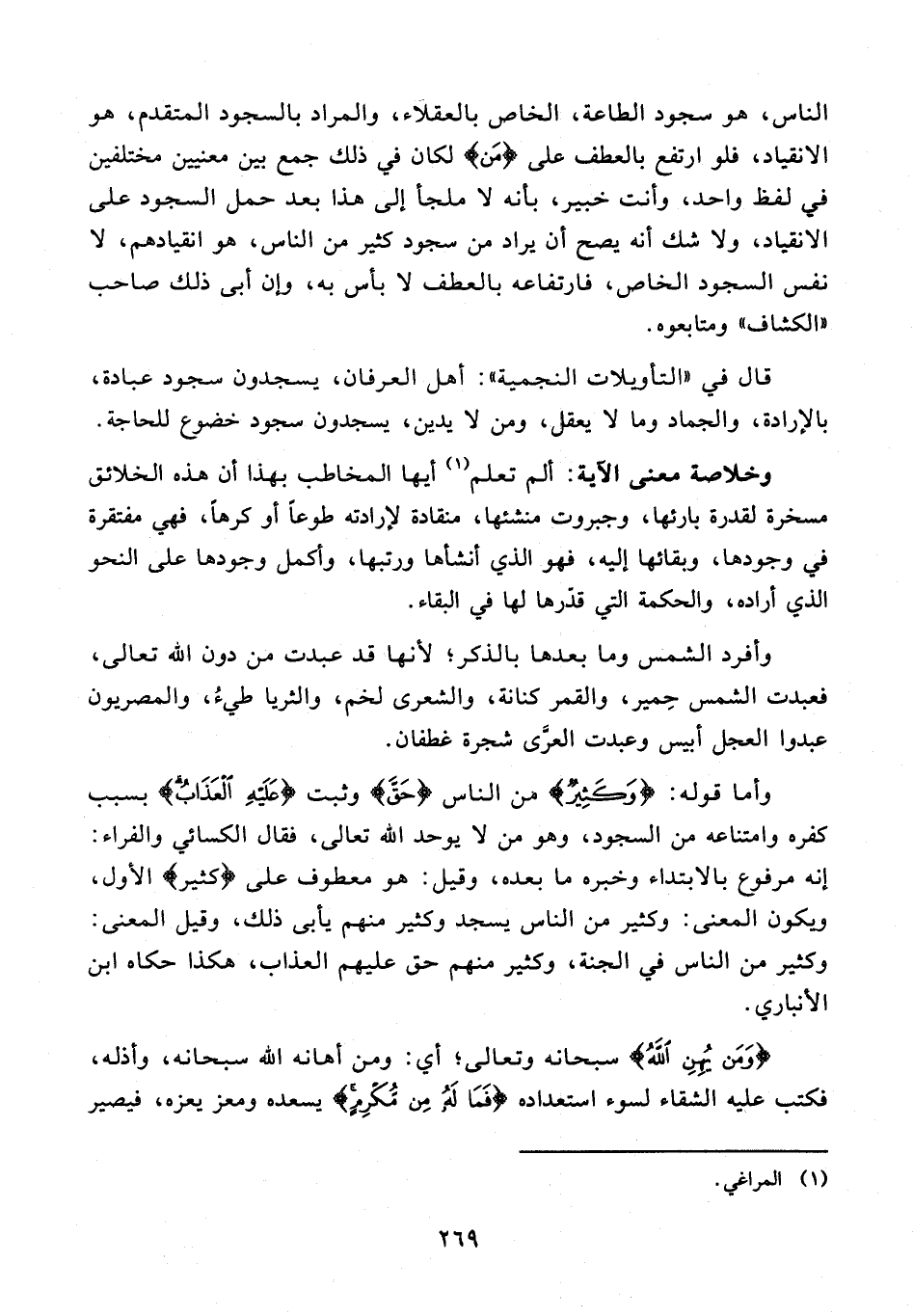 الناس، هو سجود الطاعة، الخاص بالعقلاء، والمراد بالسجود المتقدم، هو الانقياد، فلو ارتفع بالعطف على {مَن} لكان في ذلك جمع بين معنين مختلفين في لفظ واحد، وأنت خبير، بأنه لا ملجأ إلى هذا بعد حمل السجود على الانقياد، ولا شك أنه يصح أن يراد من سجود كثير من الناس، هو انقيادهم، لا نفس السجود الخاص، فارتفاعه بالعطف لا بأس به، وإن أبى ذلك صاحب "الكشاف" ومتابعوه.