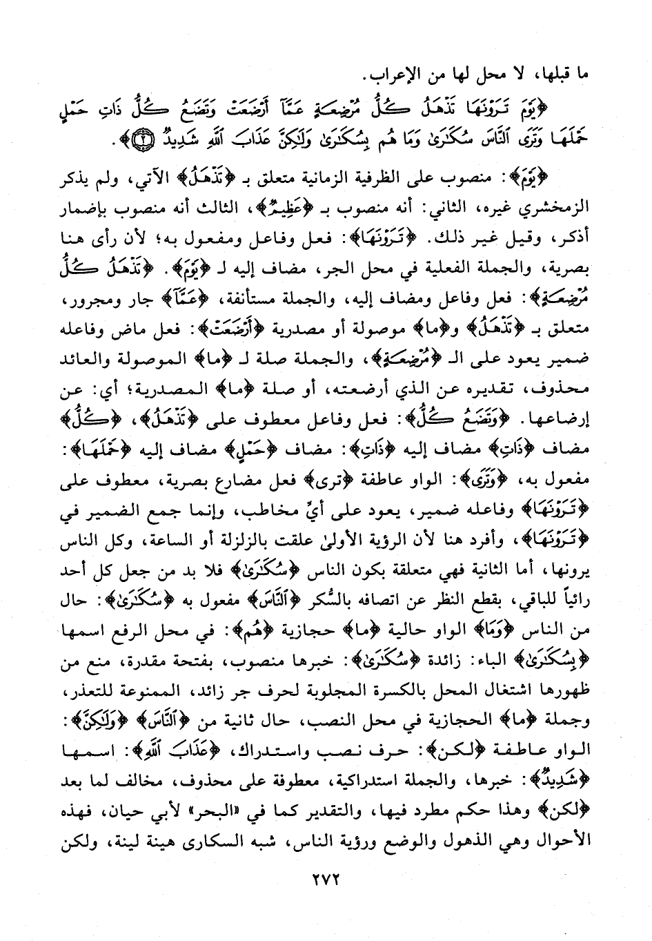 {يَوْمَ}: منصوب على الظرفية الزمانية متعلق بـ {تَذْهَلُ} الآتي، ولم يذكر الزمخشري غيره، الثاني: أنه منصوب بـ {عَظِيمٌ}، الثالث أنه منصوب بإضمار أذكر، وقيل غير ذلك. {تَرَوْنَهَا}: فعل وفاعل ومفعول به؛ لأن رأى هنا بصرية، والجملة الفعلية في محل الجر، مضاف إليه لـ {يَوْمَ}. {تَذْهَلُ كُلُّ مُرْضِعَةٍ}: فعل وفاعل ومضاف إليه، والجملة مستأنفة، {عَمَّا} جار ومجرور، متعلق بـ {تَذْهَلُ} و {ما} موصولة أو مصدرية {أَرْضَعَتْ}: فعل ماض وفاعله ضمير يعود على الـ {مُرْضِعَةٍ}، والجملة صلة لـ {ما} الموصولة والعائد محذوف، تقديره عن الذي أرضعته، أو صلة {ما} المصدرية؛ أي: عن إرضاعها. {وَتَضَعُ كُلُّ}: فعل وفاعل معطوف على {تَذْهَلُ}، {كُلُّ} مضاف {ذَاتِ} مضاف إليه {ذَاتِ}: مضاف {حَمْلٍ} مضاف إليه {حَمْلَهَا}: مفعول به، {وَتَرَى}: الواو عاطفة {ترى} فعل مضارع بصرية، معطوف على {تَرَوْنَهَا} وفاعله ضمير، يعود على أيِّ مخاطب، وإنما جمع الضمير في {تَرَوْنَهَا}، وأفرد هنا لأن الرؤية الأولى علقت بالزلزلة أو الساعة، وكل الناس يرونها، أما الثانية فهي متعلقة يكون الناس {سُكَارَى} فلا بد من جعل كل أحد رائياً للباقي، بقطع النظر عن اتصافه بالسُّكر {النَّاسَ} مفعول به {سُكَارَى}: حال من الناس {وَمَا} الواو حالية {ما} حجازية {هُمْ}: في محل الرفع اسمها {بِسُكَارَى} الباء: زائدة {سُكَارَى}: خبرها منصوب، بفتحة مقدرة، منع من ظهورها اشتغال المحل بالكسرة المجلوبة لحرف جر زائد، الممنوعة للتعذر، وجملة {ما} الحجازية في محل النصب، حال ثانية من {النَّاسَ} {وَلَكِنَّ}: الواو عاطفة {لكن}: حرف نصب واستدراك، {عَذَابَ اللَّهِ}: اسمها {شَدِيدٌ}: خبرها، والجملة استدراكية، معطوفة على محذوف، مخالف لما بعد {لكن} وهذا حكم مطرد فيها، والتقدير كما في "البحر" لأبي حيان، فهذه الأحوال وهي الذهول والوضع ورؤية الناس، شبه السكارى هينة لينة، ولكن