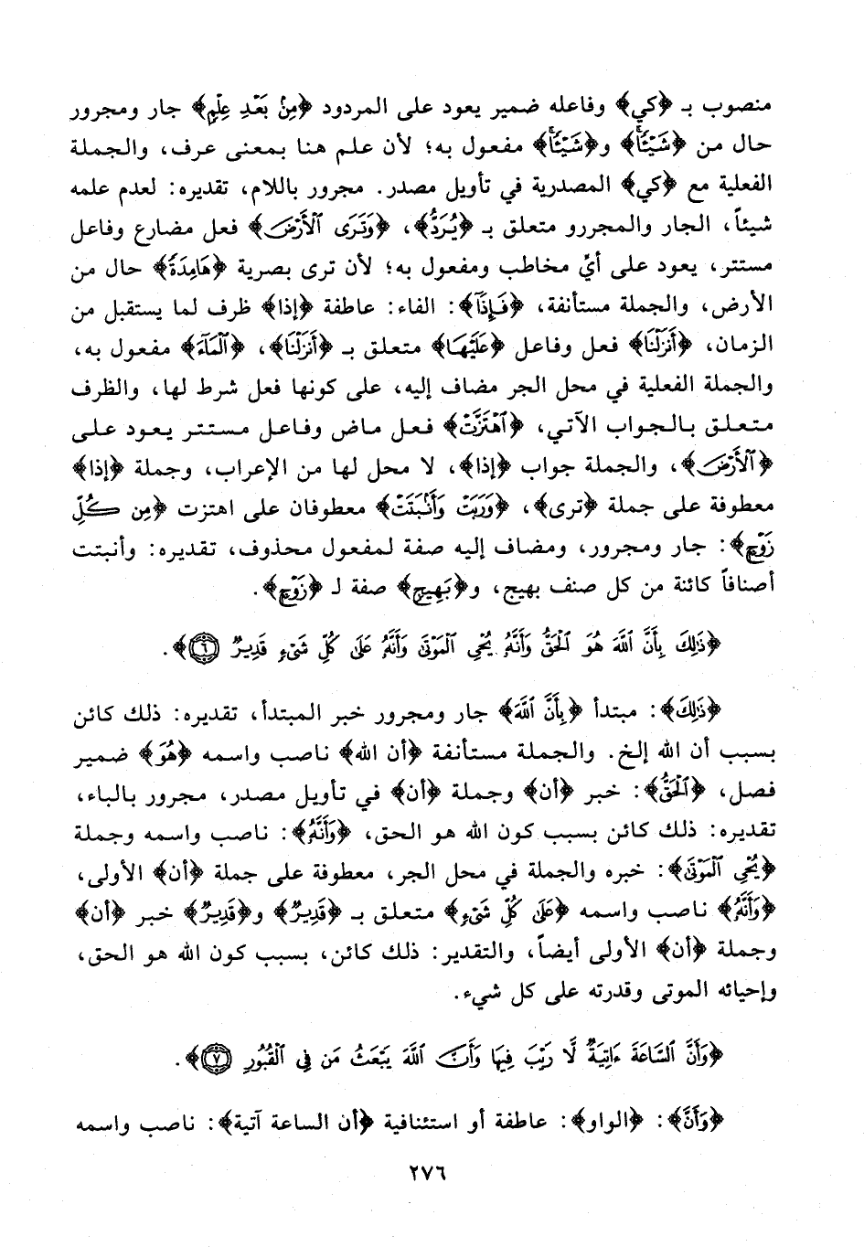 منصوب بـ {كي} وفاعله ضمير يعود على المردود {مِنْ بَعْدِ عِلْمٍ} جار ومجرور حال من {شَيْئًا} و {شَيْئًا} مفعول به؛ لأن علم هنا بمعنى عرف، والجملة الفعلية مع {كي} المصدرية في تأويل مصدر. مجرور باللام، تقديره: لعدم علمه شيئًا، الجار والمجررو متعلق بـ {يُرَدُّ}، {وَتَرَى الْأَرْضَ} فعل مضارع وفاعل مستتر، يعود على أيِّ مخاطب ومفعول به؛ لأن ترى بصرية {هَامِدَةً} حال من الأرض، والجملة مستأنفة، {فَإِذَا}: الفاء: عاطفة {إذا} ظرف لما يستقبل من الزمان، {أَنْزَلْنَا} فعل وفاعل {عَلَيْهَا} متعلق بـ {أَنْزَلْنَا}، {الْمَاءَ} مفعول به، والجملة الفعلية في محل الجر مضاف إليه، على كونها فعل شرط لها، والظرف متعلق بالجواب الآتي، {اهْتَزَّتْ} فعل ماض وفاعل مستتر يعود على {الْأَرْضَ}، والجملة جواب {إذا}، لا محل لها من الإعراب، وجملة {إذا} معطوفة على جملة {ترى}، {وَرَبَتْ وَأَنْبَتَتْ} معطوفان على اهتزت {مِنْ كُلِّ زَوْجٍ}: جار ومجرور، ومضاف إليه صفة لمفعول محذوف، تقديره: وأنبتت أصنافًا كائنة من كل صنف بهيج، و {بَهِيجٍ} صفة لـ {زَوْجٍ}.