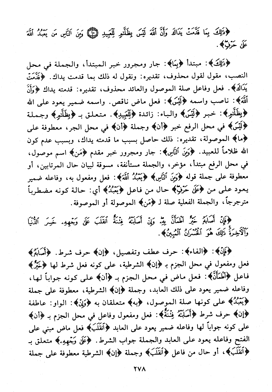 {ذَلِكَ}: مبتدأ {بِمَا}: جار ومجرور خبر المبتدأ، والجملة في محل النصب، مقول لقول محذوف، تقديره: ونقول له ذلك بما قدمت يداك. {قَدَّمَتْ يَدَاكَ}. فعل وفاعل صلة الموصول والعائد محذوف، تقديره: قدمته يداك {وَأَنَّ اللَّهَ}: ناصب واسمه {لَيْسَ}: فعل ماض ناقص. واسمه ضمير يعود على الله {بِظَلَّامٍ}: خبر {لَيْسَ} والباء: زائدة {لِلْعَبِيدِ}. متعلق بـ {بِظَلَّامٍ} وجملة {لَيْسَ} في محل الرفع خبر {أن} وجملة {أن} في محل الجر، معطوفة على {ما} الموصولة، تقديره: ذلك حاصل بسبب ما قدمته يداك، وبسبب عدم كون الله ظلاماً للعبيد. {وَمِنَ النَّاسِ}: جار ومجرور خبر مقدم {مَن} اسم موصول، في محل الرفع مبتدأ، مؤخر، والجملة مستأنفة، مسوقة لبيان حال المرتابين، أو معطوفة على جملة قوله {وَمِنَ النَّاسِ} {يَعْبُدُ اللَّهَ}: فعل ومفعول به، وفاعله ضمير يعود على من {عَلَى حَرْفٍ} حال من فاعل {يَعْبُدُ} أي: حالة كونه مضطرباً مترجرجاً، والجملة الفعلية صلة لـ {مَن} الموصولة أو الموصوفة.