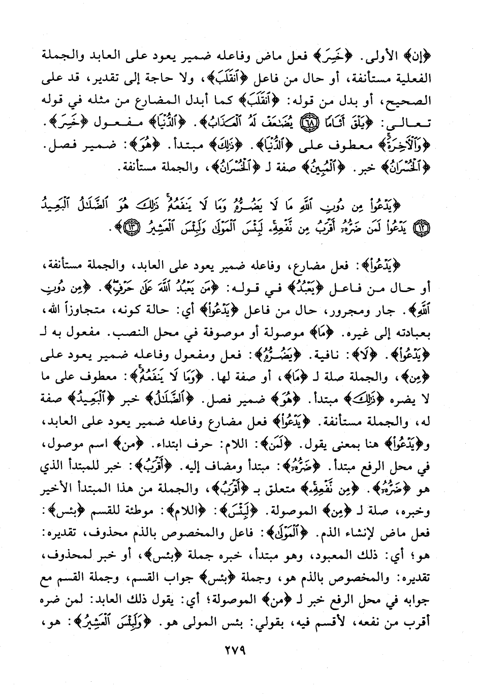 {يَدْعُو}: فعل مضارع، وفاعله ضمير يعود على العابد، والجملة مستأنفة، أو حال من فاعل {يَعْبُدُ} في قوله: {مَنْ يَعْبُدُ اللَّهَ عَلَى حَرْفٍ}. {مِنْ دُونِ اللَّهِ}. جار ومجرور، حال من فاعل {يَدْعُو} أي: حالة كونه، متجاوزًا الله، بعبادته إلى غيره. {مَا} موصولة أو موصوفة في محل النصب. مفعول به لـ {يَدْعُو}. {لَا}: نافية. {يَضُرُّهُ}: فعل ومفعول وفاعله ضمير يعود على {مِنْ}، والجملة صلة لـ {مَا}، أو صفة لها. {وَمَا لَا يَنْفَعُهُ}: معطوف على ما لا يضره {ذَلِكَ} مبتدأ. {هُوَ} ضمير فصل. {الضَّلَالُ} خبر {الْبَعِيدُ} صفة له، والجملة مستأنفة. {يَدْعُو} فعل مضارع وفاعله ضمير يعود على العابد، و {يَدْعُو} هنا بمعنى يقول. {لَمَنْ}: اللام: حرف ابتداء. {من} اسم موصول، في محل الرفع مبتدأ. {ضَرُّهُ}: مبتدأ ومضاف إليه. {أَقْرَبُ}: خبر للمبتدأ الذي هو {ضَرُّهُ}،. {مِنْ نَفْعِهِ} متعلق بـ {أَقْرَبُ}، والجملة من هذا المبتدأ الأخير وخبره، صلة لـ {مِنْ} الموصولة. {لَبِئْسَ}: اللام: موطئة للقسم {بئس}: فعل ماض لإنشاء الذم. {الْمَوْلَى}: فاعل والمخصوص بالذم محذوف، تقديره: هو؛ أي: ذلك المعبود، وهو مبتدأ، خبره جملة {بئس}، أو خبر لمحذوف، تقديره: والمخصوص بالذم هو، وجملة {بئس} جواب القسم، وجملة القسم مع جوابه في محل الرفع خبر لـ {من} الموصولة؛ أي: يقول ذلك العابد: لمن ضره أقرب من نفعه، لأقسم فيه، بقولي: بئس المولى هو. {وَلَبِئْسَ الْعَشِيرُ}: هو،