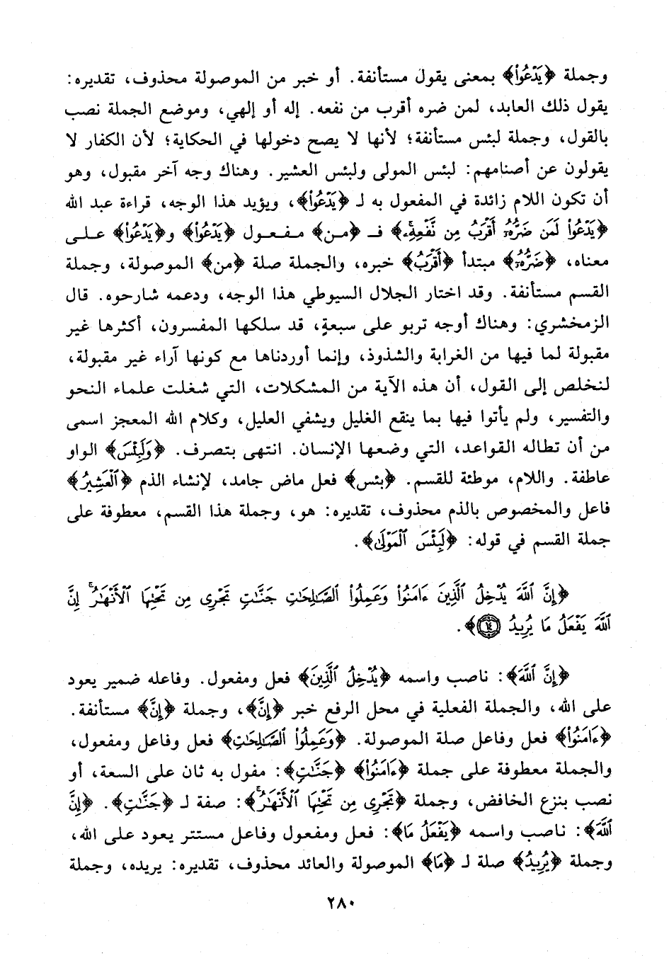 وجملة {يَدْعُو} بمعنى يقول مستأنفة. أو خبر من الموصولة محذوف، تقديره: يقول ذلك العابد، لمن ضره أقرب من نفعه. إله أو إلهي، وموضع الجملة نصب بالقول، وجملة لبئس مستأنفة؛ لأنها لا يصح دخولها في الحكاية؛ لأن الكفار لا يقولون عن أصنامهم: لبئس المولى ولبئس العشير. وهناك وجه آخر مقبول، وهو أن تكون اللام زائدة في المفعول به لـ {يَدْعُو}، ويؤيد هذا الوجه، قراءة عبد الله {يَدْعُو لَمَنْ ضَرُّهُ أَقْرَبُ مِنْ نَفْعِهِ} فـ {من} مفعول {يَدْعُو} و {يَدْعُو} على معناه، {ضَرُّهُ} مبتدأ {أَقْرَبُ} خبره، والجملة صلة {من} الموصولة، وجملة القسم مستأنفة. وقد اختار الجلال السيوطي هذا الوجه، ودعمه شارحوه. قال الزمخشري: وهناك أوجه تربو على سبعةٍ، قد سلكها المفسرون، أكثرها غير مقبولة لما فيها من الغرابة والشذوذ، وإنما أوردناها مع كونها آراء غير مقبولة، لنخلص إلى القول، أن هذه الآية من المشكلات، التي شغلت علماء النحو والتفسير، ولم يأتوا فيها بما ينقع الغليل ويشفي العليل، وكلام الله المعجز اسمى من أن تطاله القواعد، التي وضعها الإنسان. انتهى بتصرف. {وَلَبِئْسَ} الواو عاطفة. واللام، موطئة للقسم. {بئس} فعل ماض جامد، لإنشاء الذم {الْعَشِيرُ} فاعل والمخصوص بالذم محذوف، تقديره: هو، وجملة هذا القسم، معطوفة على جملة القسم في قوله: {لَبِئْسَ الْمَوْلَى}.
