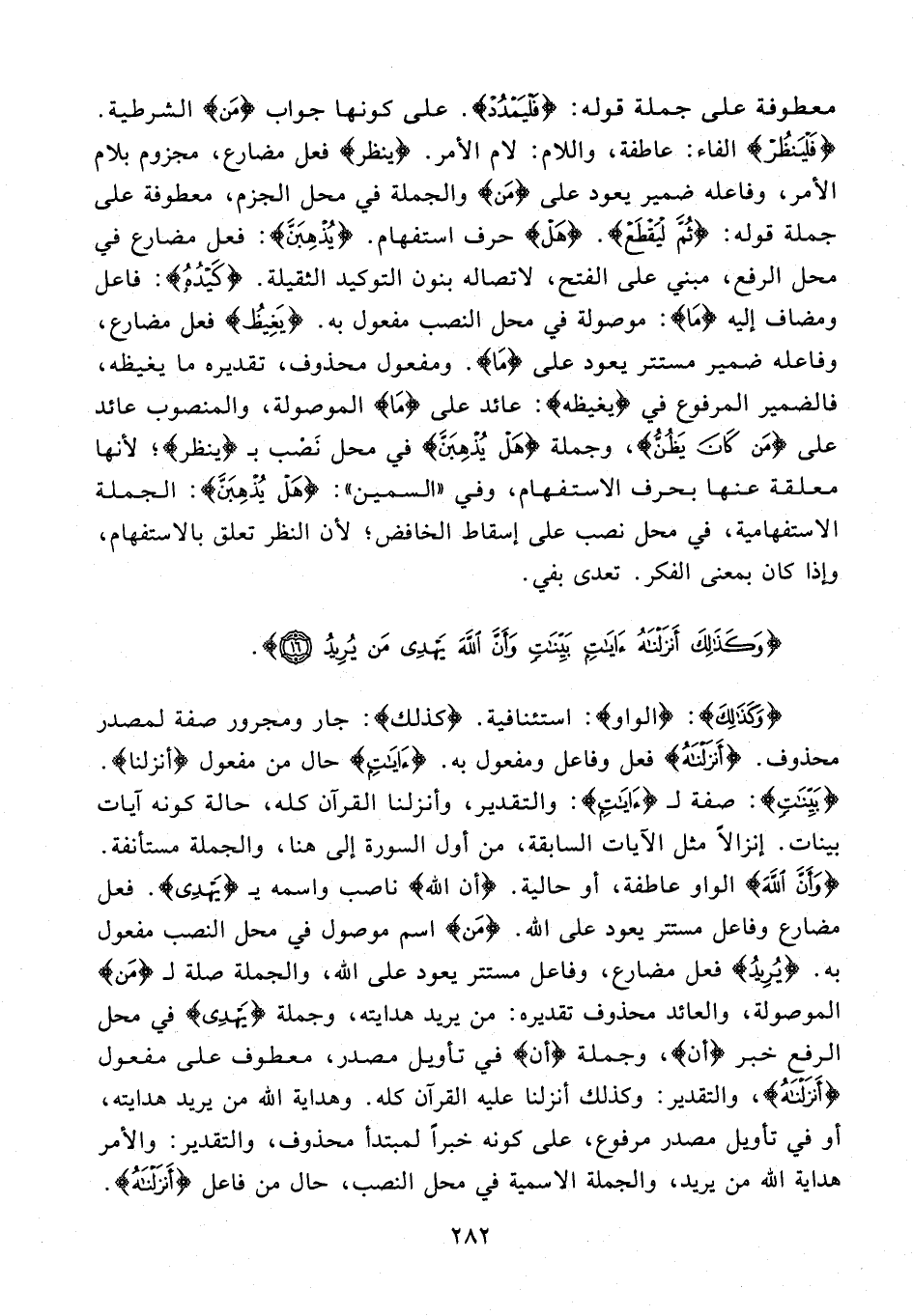{وَكَذَلِكَ}: {الواو}: استئنافية. {كذلك}: جار ومجرور صفة لمصدر محذوف. {أَنْزَلْنَاهُ} فعل وفاعل ومفعول به. {آيَاتٍ} حال من مفعول {أنزلنا}. {بَيِّنَاتٍ}: صفة لـ {آيَاتٍ}: والتقدير، وأنزلنا القرآن كله، حالة كونه آيات بينات. إنزالًا مثل الآيات السابقة، من أول السورة إلى هنا، والجملة مستأنفة. {وَأَنَّ اللَّهَ} الواو عاطفة، أو حالية. {أن الله} ناصب واسمه بـ {يَهْدِي}. فعل مضارع وفاعل مستتر يعود على الله. {مَن} اسم موصول في محل النصب مفعول به. {يُرِيدُ} فعل مضارع، وفاعل مستتر يعود على الله، والجملة صلة لـ {مَن} الموصولة، والعائد محذوف تقديره: من يريد هدايته، وجملة {يَهْدِي} في محل الرفِع خبر {أن}، وجملة {أن} في تأويل مصدر، معطوف على مفعول {أَنْزَلْنَاهُ}، والتقدير: وكذلك أنزلنا عليه القرآن كله. وهداية الله من يريد هدايته، أو في تأويل مصدر مرفوع، على كونه خبرًا لمبتدأ محذوف، والتقدير: والأمر هداية الله من يريد، والجملة الاسمية في محل النصب، حال من فاعل {أَنْزَلْنَاهُ}.