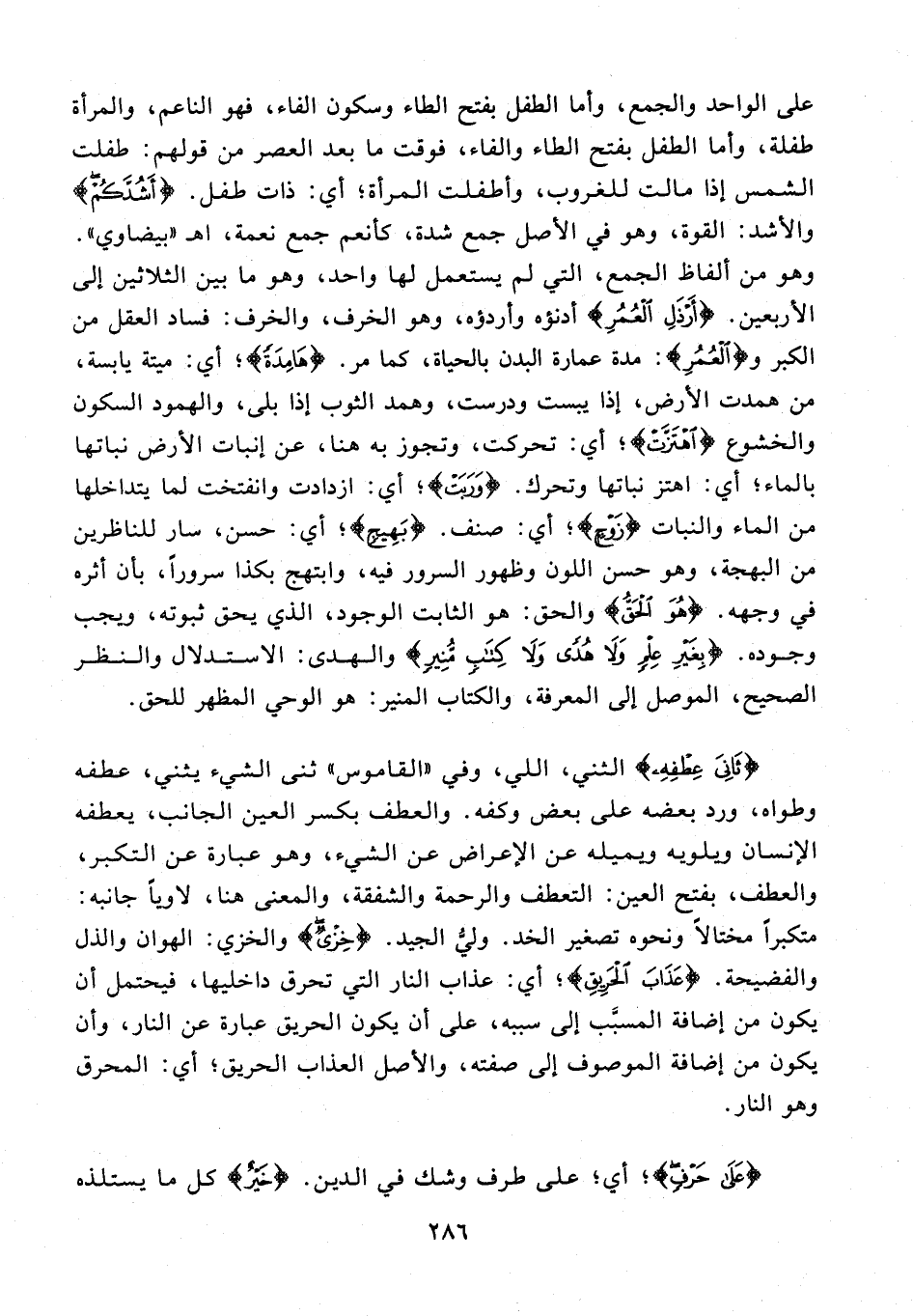 {ثَانِيَ عِطْفِهِ} الثني، اللي، وفي "القاموس" ثنى الشيء يثني، عطفه وطواه، ورد بعضه على بعض وكفه. والعطف بكسر العين الجانب، يعطفه الإنسان ويلويه ويميله عن الإعراض عن الشيء، وهو عبارة عن التكبر، والعطف، بفتح العين: التعطف والرحمة والشفقة، والمعنى هنا، لاويًا جانبه: متكبرًا مختالًا ونحوه تصغير الخد. وليُّ الجيد. {خِزْيٌ} والخزي: الهوان والذل والفضيحة. {عَذَابَ الْحَرِيقِ}؛ أي: عذاب النار التي تحرق داخليها، فيحتمل أن يكون من إضافة المسبَّب إلى سببه، على أن يكون الحريق عبارة عن النار، وأن يكون من إضافة الموصوف إلى صفته، والأصل العذاب الحريق؛ أي: المحرق وهو النار.