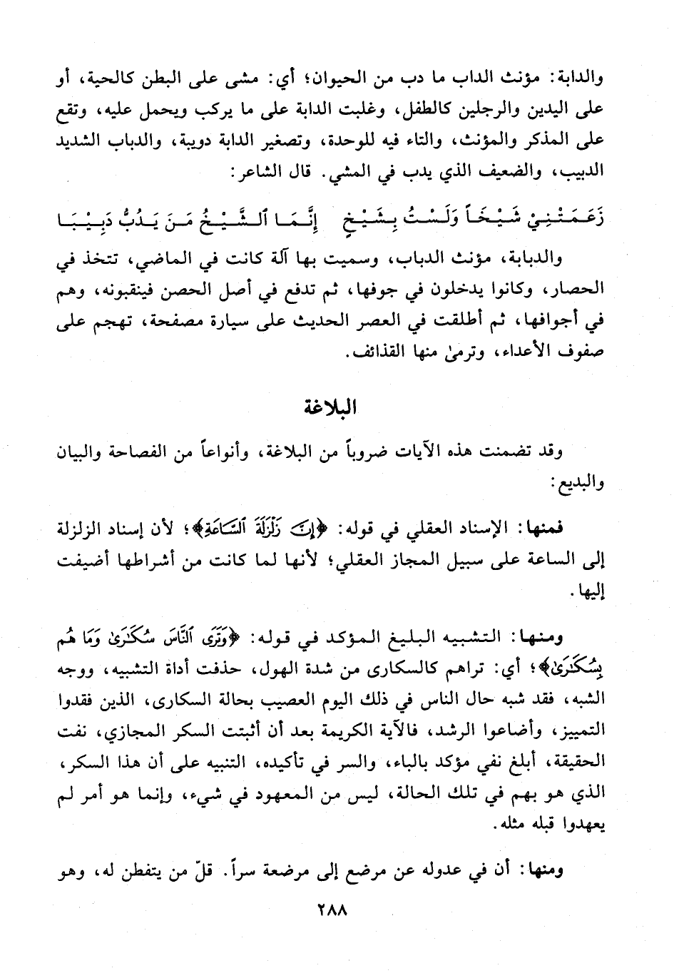 فمنها: الإسناد العقلي في قوله: {إِنَّ زَلْزَلَةَ السَّاعَةِ}؛ لأن إسناد الزلزلة إلى الساعة على سبيل المجاز العقلي؛ لأنها لما كانت من أشراطها أضيفت إليها.