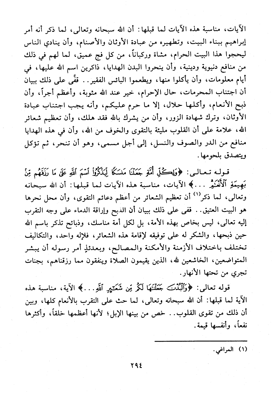 قوله تعالى: {وَالْبُدْنَ جَعَلْنَاهَا لَكُمْ مِنْ شَعَائِرِ اللَّهِ ...} الآية، مناسبة هذه الآية لما قبلها: أن الله سبحانه وتعالى، لما حث على التقرب بالأنعام كلها، وبين أن ذلك من تقوى القلوب .. خص من بينها الإبل؛ لأنها أعظمها خلقًا، وأكثرها نفعًا، وأنفسها قيمة.