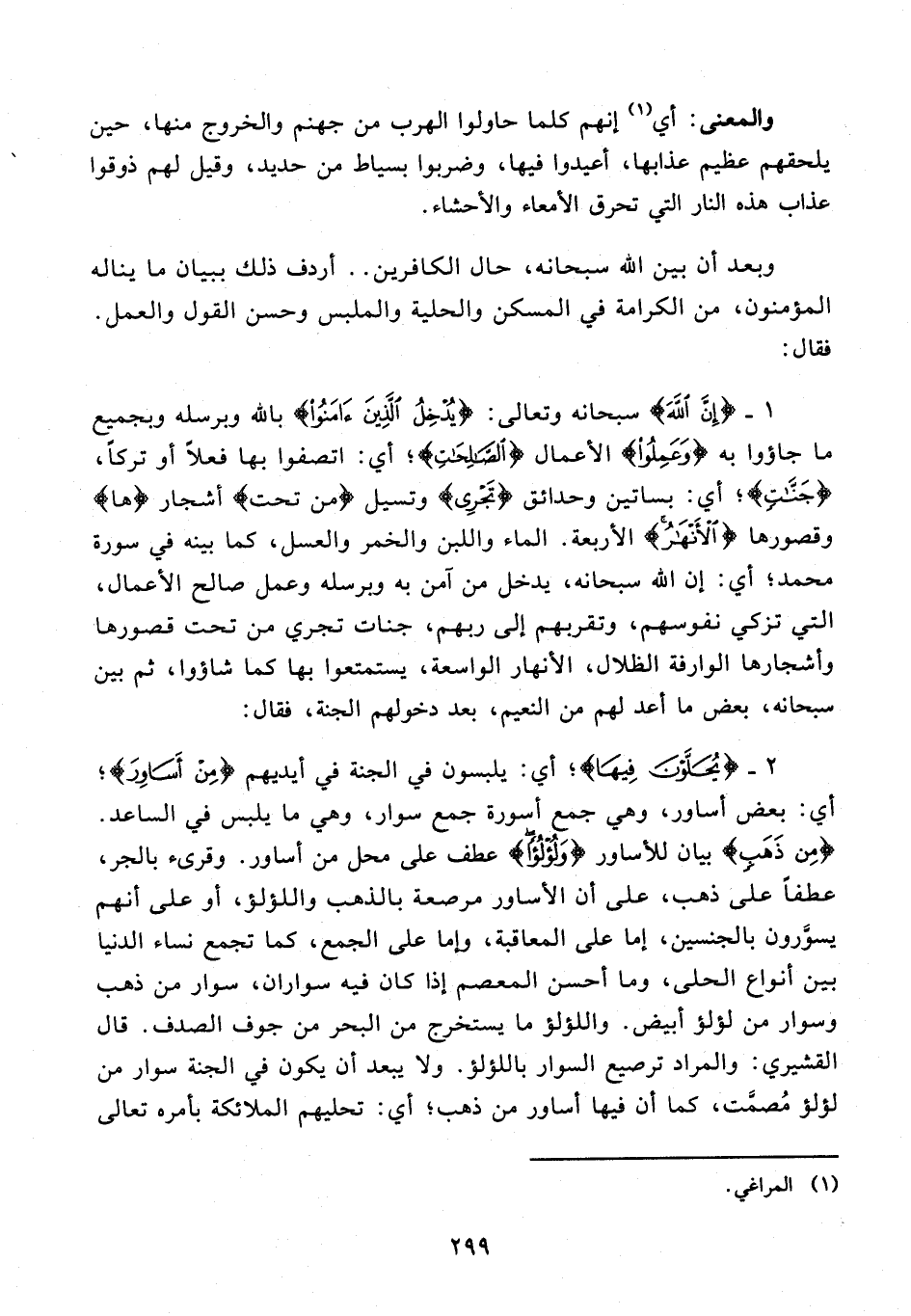 2 - {يُحَلَّوْنَ فِيهَا}؛ أي: يلبسون في الجنة في أيديهم {مِنْ أَسَاوِرَ}؛ أي: بعض أساور، وهي جمع أسورة جمع سوار، وهي ما يلبس في الساعد. {مِنْ ذَهَبٍ} بيان للأساور {وَلُؤْلُؤًا} عطف على محل من أساور. وقرىء بالجر، عطفًا على ذهب، على أن الأساور مرصعة بالذهب واللؤلؤ، أو على أنهم يسوَّرون بالجنسين، إما على المعاقبة، وإما على الجمع، كما تجمع نساء الدنيا بن أنواع الحلى، وما أحسن المعصم إذا كان فيه سواران، سوار من ذهب وسوار من لؤلؤ أبيض. واللؤلؤ ما يستخرج من البحر من جوف الصدف. قال القشيري: والمراد ترصيع السوار باللؤلؤ. ولا يبعد أن يكون في الجنة سوار من لؤلؤ مُصمَّت، كما أن فيها أساور من ذهب؛ أي: تحليهم الملائكة بأمره تعالى