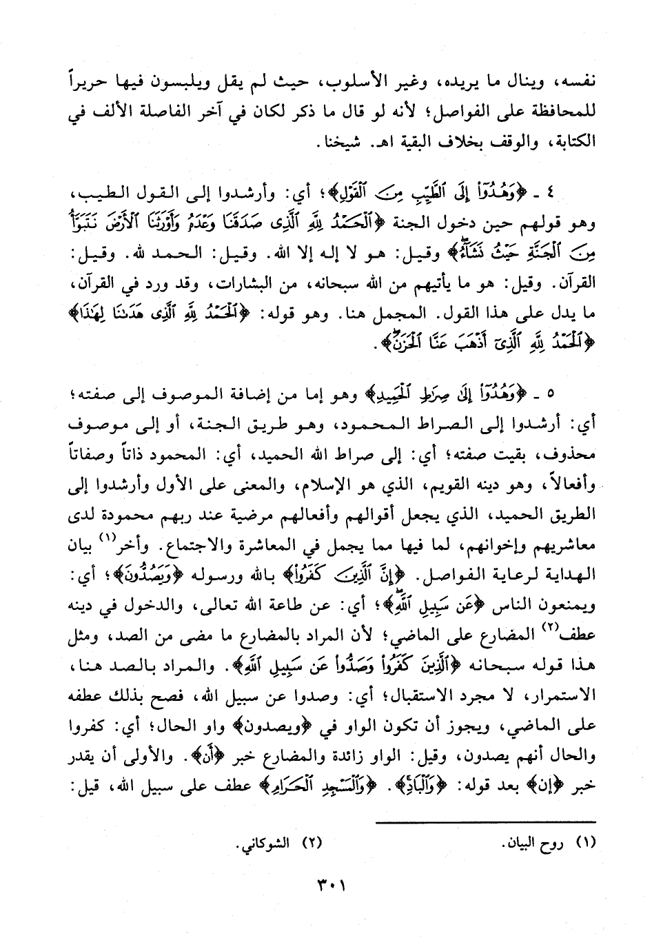 5 - {وَهُدُوا إِلَى صِرَاطِ الْحَمِيدِ} وهو إما من إضافة الموصوف إلى صفته؛ أي: أرشدوا إلى الصراط المحمود، وهو طريق الجنة، أو إلى موصوف محذوف، بقيت صفته؛ أي: إلى صراط الله الحميد، أي: المحمود ذاتًا وصفاتًا وأفعالًا، وهو دينه القويم، الذي هو الإسلام، والمعنى على الأول وأرشدوا إلى الطريق الحميد، الذي يجعل أقوالهم وأفعالهم مرضية عند ربهم محمودة لدى معاشريهم وإخوانهم، لما فيها مما يجمل في المعاشرة والاجتماع. وأخر (¬1) بيان الهداية لرعاية الفواصل.