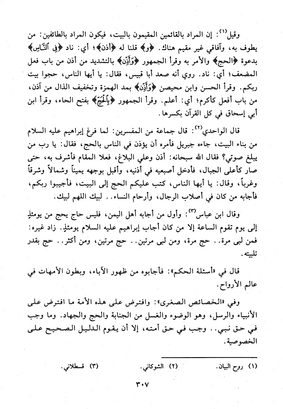 قال الواحدي (¬2): قال جماعة من المفسرين: لما فرغ إبراهيم عليه السلام من بناء البيت، جاءه جبريل فأمره أن يؤذن في الناس بالحج، فقال: يا رب من يبلغ صوتي؟ فقال الله سبحانه: أذن وعلي البلاغ، فعلا المقام فأشرف به، حتى صار كأعلى الجبال، فأدخل أصبعيه في أذنيه، وأقبل بوجهه يمينًا وشمالًا وشرقًا وغربًا، وقال: يا أيها الناس، كتب عليكم الحج إلى البيت، فأجيبوا ربكم، فأجابه من كان في أصلاب الرجال، وأرحام النساء .. لبيك اللهم لبيك.