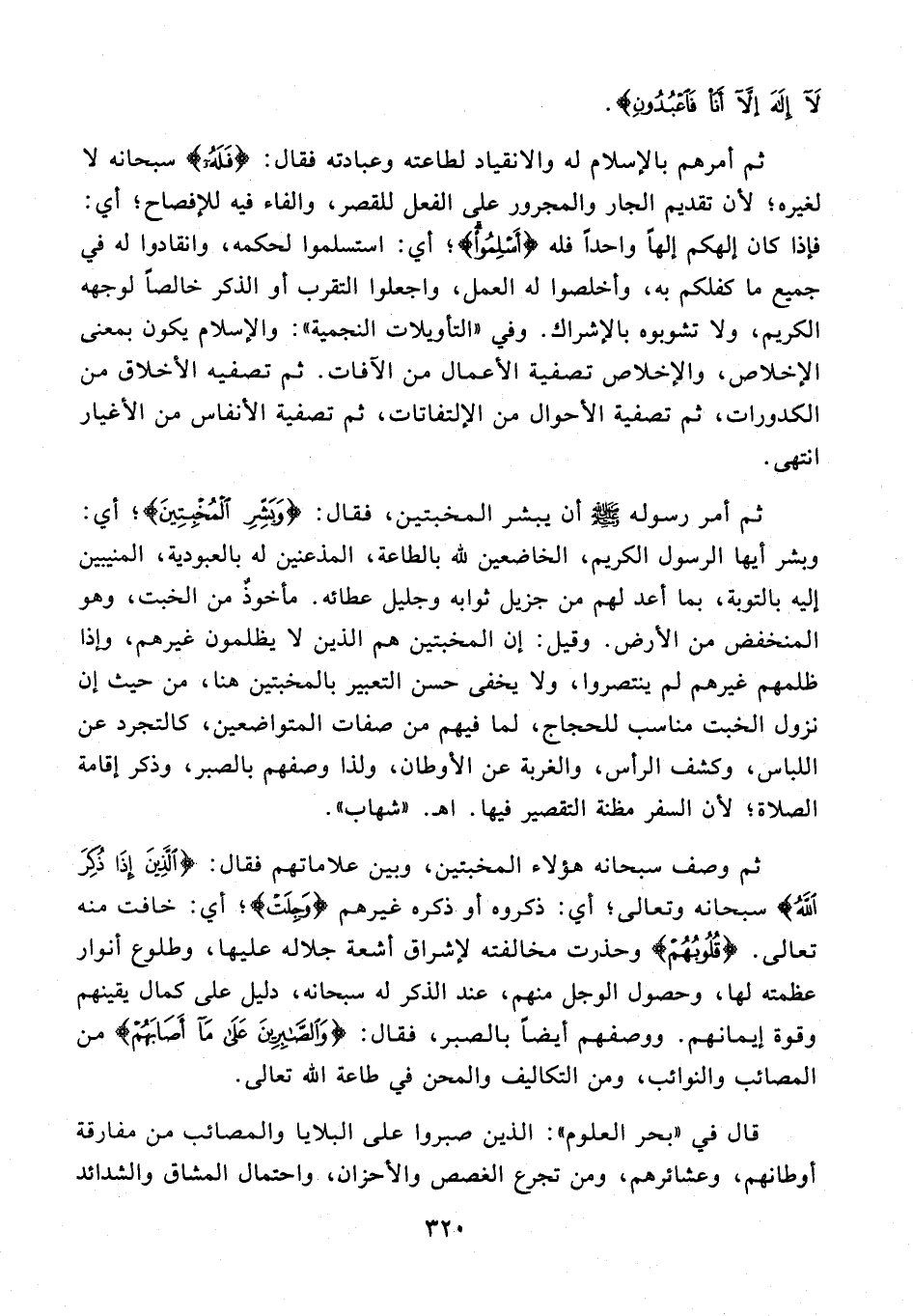 ثم أمر رسوله - صلى الله عليه وسلم - أن يبشر المخبتين، فقال: {وَبَشِّرِ الْمُخْبِتِينَ}؛ أي: وبشر أيها الرسول الكريم، الخاضعين لله بالطاعة، المذعنين له بالعبودية، المنيبين إليه بالتوبة، بما أعد لهم من جزيل ثوابه وجليل عطائه. مأخوذٌ من الخبت، وهو المنخفض من الأرض. وقيل: إن المخبتين هم الذين لا يظلمون غيرهم، وإذا ظلمهم غيرهم لم ينتصروا، ولا يخفى حسن التعبير بالمخبتين هنا، من حيث إن نزول الخبت مناسب للحجاج، لما فيهم من صفات المتواضعين، كالتجرد عن اللباس، وكشف الرأس، والغربة عن الأوطان، ولذا وصفهم بالصبر، وذكر إقامة الصلاة؛ لأن السفر مظنة التقصير فيها. اهـ. "شهاب".