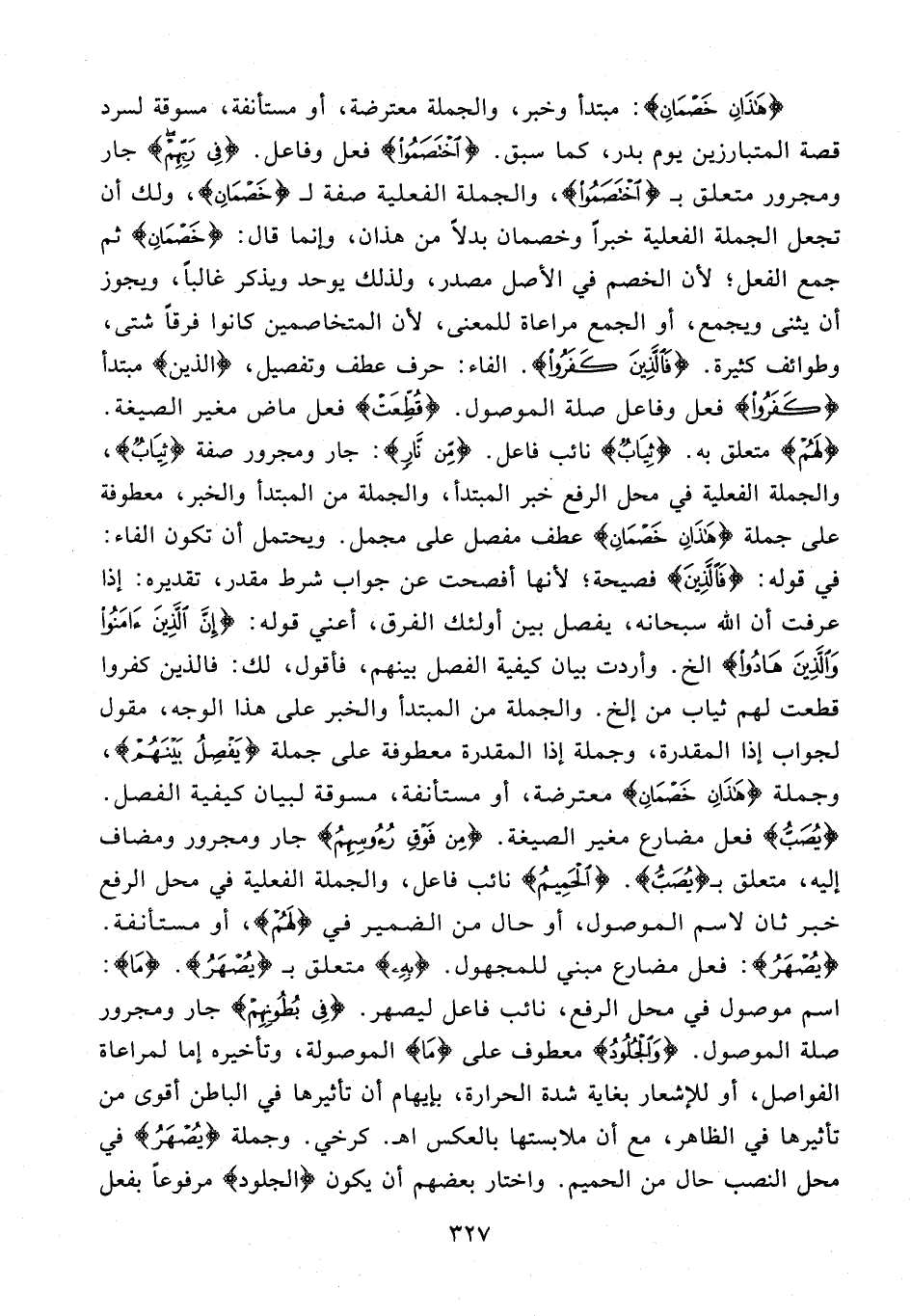 {هَذَانِ خَصْمَانِ}: مبتدأ وخبر، والجملة معترضة، أو مستأنفة، مسوقة لسرد قصة المتبارزين يوم بدر، كما سبق. {اخْتَصَمُوا} فعل وفاعل. {فِي رَبِّهِمْ} جار ومجرور متعلق بـ {اخْتَصَمُوا}، والجملة الفعلية صفة لـ {خَصْمَانِ}، ولك أن تجعل الجملة الفعلية خبرًا وخصمان بدلًا من هذان، وإنما قال: {خَصْمَانِ} ثم جمع الفعل؛ لأن الخصم في الأصل مصدر، ولذلك يوحد ويذكر غالبًا، ويجوز أن يثنى ويجمع، أو الجمع مراعاة للمعنى؛ لأن المتخاصمين كانوا فرقًا شتى، وطوائف كثيرة. {فَالَّذِينَ كَفَرُوا}. الفاء: حرف عطف وتفصيل، {الذين} مبتدأ {كَفَرُوا} فعل وفاعل صلة الموصول. {قُطِّعَتْ} فعل ماض مغير الصيغة. {لَهُمْ} متعلق به. {ثِيَابٌ} نائب فاعل. {مِنْ نَارٍ}: جار ومجرور صفة {ثِيَابٌ}، والجملة الفعلية في محل الرفع خبر المبتدأ، والجملة من المبتدأ والخبر، معطوفة على جملة {هَذَانِ خَصْمَانِ} عطف مفصل على مجمل. ويحتمل أن تكون الفاء: في قوله: {فَالَّذِينَ} فصيحة؛ لأنها أفصحت عن جواب شرط مقدر، تقديره: إذا عرفت أن الله سبحانه، يفصل بين أولئك الفرق، أعني قوله: {إِنَّ الَّذِينَ آمَنُوا وَالَّذِينَ هَادُوا} الخ. وأردت بيان كيفية الفصل بينهم، فأقول، لك: فالذين كفروا قطعت لهم ثياب من إلخ. والجملة من المبتدأ والخبر على هذا الوجه، مقول لجواب إذا المقدرة، وجملة إذا المقدرة معطوفة على جملة {يَفْصِلُ بَيْنَهُمْ}، وجملة {هَذَانِ خَصْمَانِ} معترضة، أو مستأنفة، مسوقة لبيان كيفية الفصل. {يُصَبُّ} فعل مضارع مغير الصيغة. {مِنْ فَوْقِ رُءُوسِهِمُ} جار ومجرور ومضاف إليه، متعلق بـ {يُصَبُّ}. {الْحَمِيمُ} نائب فاعل، والجملة الفعلية في محل الرفع خبر ثان لاسم الموصول، أو حال من الضمير في {لَهُمْ}، أو مستأنفة. {يُصْهَرُ}: فعل مضارع مبني للمجهول. {بِهِ} متعلق بـ {يُصْهَرُ}. {مَا}: اسم موصول في محل الرفع، نائب فاعل ليصهر. {فِي بُطُونِهِمْ} جار ومجرور صلة الموصول. {وَالْجُلُودُ} معطوف على {مَا} الموصولة، وتأخيره إما لمراعاة الفواصل، أو للإشعار بغاية شدة الحرارة، بإيهام أن تأثيرها في الباطن أقوى من تأثيرها في الظاهر، مع أن ملابستها بالعكس اهـ. كرخي. وجملة {يُصْهَرُ} في محل النصب حال من الحميم. واختار بعضهم أن يكون {الجلود} مرفوعًا بفعل