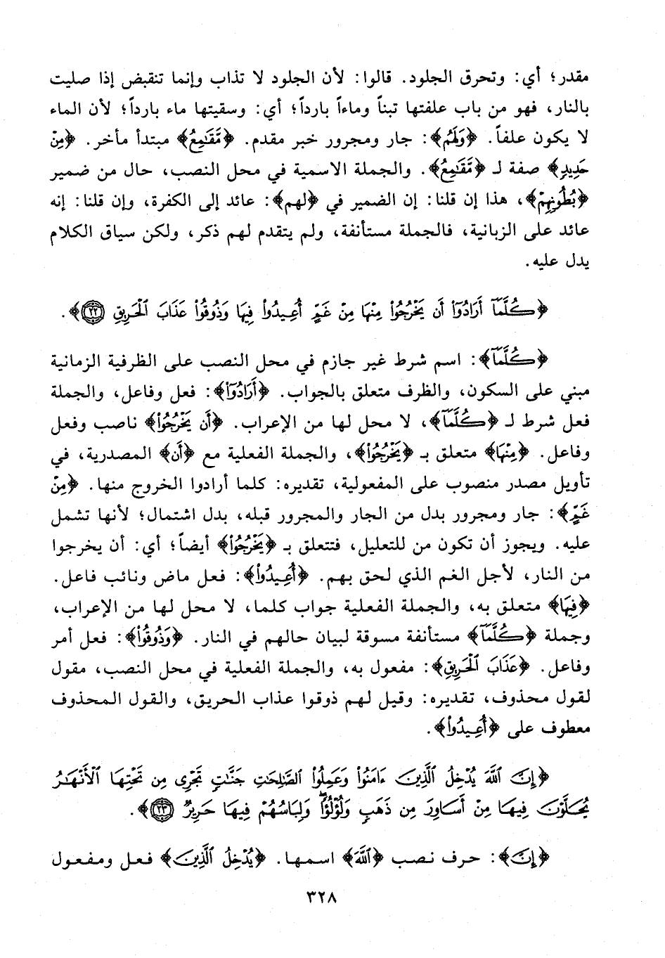 {كُلَّمَا}: اسم شرط غير جازم في محل النصب على الظرفية الزمانية مبني على السكون، والظرف متعلق بالجواب. {أَرَادُوا}: فعل وفاعل، والجملة فعل شرط لـ {كُلَّمَا}، لا محل لها من الإعراب. {أَنْ يَخْرُجُوا} ناصب وفعل وفاعل. {مِنْهَا} متعلق بـ {يَخْرُجُوا}، والجملة الفعلية مع {أَن} المصدرية، في تأويل مصدر منصوب على المفعولية، تقديره: كلما أرادوا الخروج منها. {مِنْ غَمٍّ}: جار ومجرور بدل من الجار والمجرور قبله، بدل اشتمال؛ لأنها تشمل عليه. ويجوز أن تكون من للتعليل، فتتعلق بـ {يَخْرُجُوا} أيضًا؛ أي: أن يخرجوا من النار، لأجل الغم الذي لحق بهم. {أُعِيدُوا}: فعل ماض ونائب فاعل. {فِيهَا} متعلق به، والجملة الفعلية جواب كلما، لا محل لها من الإعراب، وجملة {كُلَّمَا} مستأنفة مسوقة لبيان حالهم في النار. {وَذُوقُوا}: فعل أمر وفاعل. {عَذَابَ الْحَرِيقِ}: مفعول به، والجملة الفعلية في محل النصب، مقول لقول محذوف، تقديره: وقيل لهم ذوقوا عذاب الحريق، والقول المحذوف معطوف على {أُعِيدُوا}.