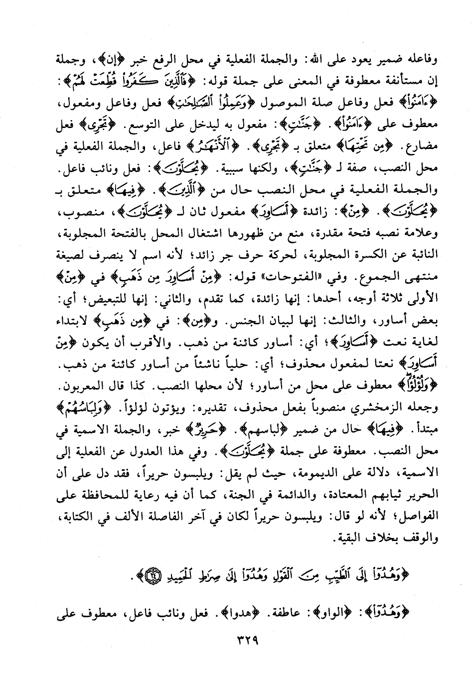 وفاعله ضمير يعود على الله: والجملة الفعلية في محل الرفع خبر {إن}، وجملة إن مستأنفة معطوفة في المعنى على جملة قوله: {فَالَّذِينَ كَفَرُوا قُطِّعَتْ لَهُمْ}: {آمَنُوا} فعل وفاعل صلة الموصول {وَعَمِلُوا الصَّالِحَاتِ} فعل وفاعل ومفعول، معطوف على {آمَنُوا}. {جَنَّاتٍ}: مفعول به ليدخل على التوسع. {تَجْرِي} فعل مضارع. {مِنْ تَحْتِهَا} متعلق بـ {تَجْرِي}. {الْأَنْهَارُ} فاعل، والجملة الفعلية في محل النصب، صفة لـ {جَنَّاتٍ}، ولكنها سببية. {يُحَلَّوْنَ}: فعل ونائب فاعل. والجملة الفعلية في محل النصب حال من {الَّذِينَ}. {فِيهَا} متعلق بـ {يُحَلَّوْنَ}. {مِنْ}: زائدة {أَسَاوِرَ} مفعول ثان لـ {يُحَلَّوْنَ}، منصوب، وعلامة نصبه فتحة مقدرة، منع من ظهورها اشتغال المحل بالفتحة المجلوبة، النائبة عن الكسرة المجلوبة، لحركة حرف جر زائد؛ لأنه اسم لا ينصرف لصيغة منتهى الجموع. وفي "الفتوحات" قوله: {مِنْ أَسَاوِرَ مِنْ ذَهَبٍ} في {مِنْ} الأولى ثلاثة أوجه، أحدها: إنها زائدة، كما تقدم، والثاني: إنها للتبعيض؛ أي: بعض أساور، والثالث: إنها لبيان الجنس. و {مِنْ}: في {مِنْ ذَهَبٍ} لابتداء لغاية نعت {أَسَاوِرَ}؛ أي: أساور كائنة من ذهب. والأقرب أن يكون {مِنْ أَسَاوِرَ} نعتا لمفعول محذوف؛ أي: حليًا ناشئاً من أساور كائنة من ذهب. {وَلُؤْلُؤًا} معطوف على محل من أساور؛ لأن محلها النصب. كذا قال المعربون. وجعله الزمخشري منصوبًا بفعل محذوف، تقديره: ويؤتون لؤلؤًا. {وَلِبَاسُهُمْ} مبتدأ. {فِيهَا} حال من ضمير {لباسهم}. {حَرِيرٌ} خبر، والجملة الاسمية في محل النصب. معطوفة على جملة {يُحَلَّوْنَ}. وفي هذا العدول عن الفعلية إلى الاسمية، دلالة على الديمومة، حيث لم يقل: ويلبسون حريرًا، فقد دل على أن الحرير ثيابهم المعتادة، والدائمة في الجنة، كما أن فيه رعاية للمحافظة على الفواصل؛ لأنه لو قال: ويلبسون حريرًا لكان في آخر الفاصلة الألف في الكتابة، والوقف بخلاف البقية.