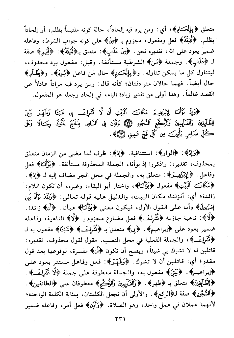 {وَإِذْ}: {الواو}: استئنافية. {إذ}: ظرف لما مضى من الزمان متعلق بمحذوف، تقديره: واذكروا إذ بوأنا، الجملة المحذوفة مستأنفة. {بَوَّأْنَا} فعل وفاعل. {لِإِبْرَاهِيمَ}: متعلق به، والجملة في محل الجر مضاف إليه لـ {إذ}. {مَكَانَ الْبَيْتِ} مفعول {بَوَّأْنَا}، واختار أبو البقاء، وغيره، أن تكون اللام: زائدة؛ أي: أنزلناه مكان البيت، والدليل عليه قوله تعالى: {وَلَقَدْ بَوَّأْنَا بَنِي إِسْرَائِيلَ} وأما على القول الأول، فيكون معنى {بَوَّأْنَا} هيأنا. {أَنْ} زائدة. {لَا}: ناهية جازمة {تُشْرِكْ} فعل مضارع مجزوم بـ {لَا} الناهية، وفاعله ضمير يعود على إبراهيم. {بِي} متعلق بـ {تُشْرِكْ} {شَيْئًا} مفعول به لـ {تُشْرِكْ}، والجملة الفعلية في محل النصب، مقول لقول محذوف، تقديره: قائلين له لا تشرك بي شيئًا، ويصح أن تكون {أَنْ} مفسرة، لوقوعها بعد قول مقدر؛ أي: قائلين أن لا تشرك. {وَطَهِّرْ}: فعل وفاعل مستتر يعود على {إبراهيم}. {بَيْتِيَ} مفعول به، والجملة معطوفة على جملة {لَا تُشْرِكْ}. {لِلطَّائِفِينَ} متعلق بـ {طهر}. {وَالْقَائِمِينَ وَالرُّكَّعِ} معطوفان على {الطائفين}. {السُّجُودِ} صفة لـ {الركع}. والأولى أن تجعل الكلمتان، بمثابة الكلمة الواحدة؛ لأنهما عملان في عمل واحد، وهو الصلاة. {وَأَذِّنْ} فعل أمر، وفاعله ضمير
