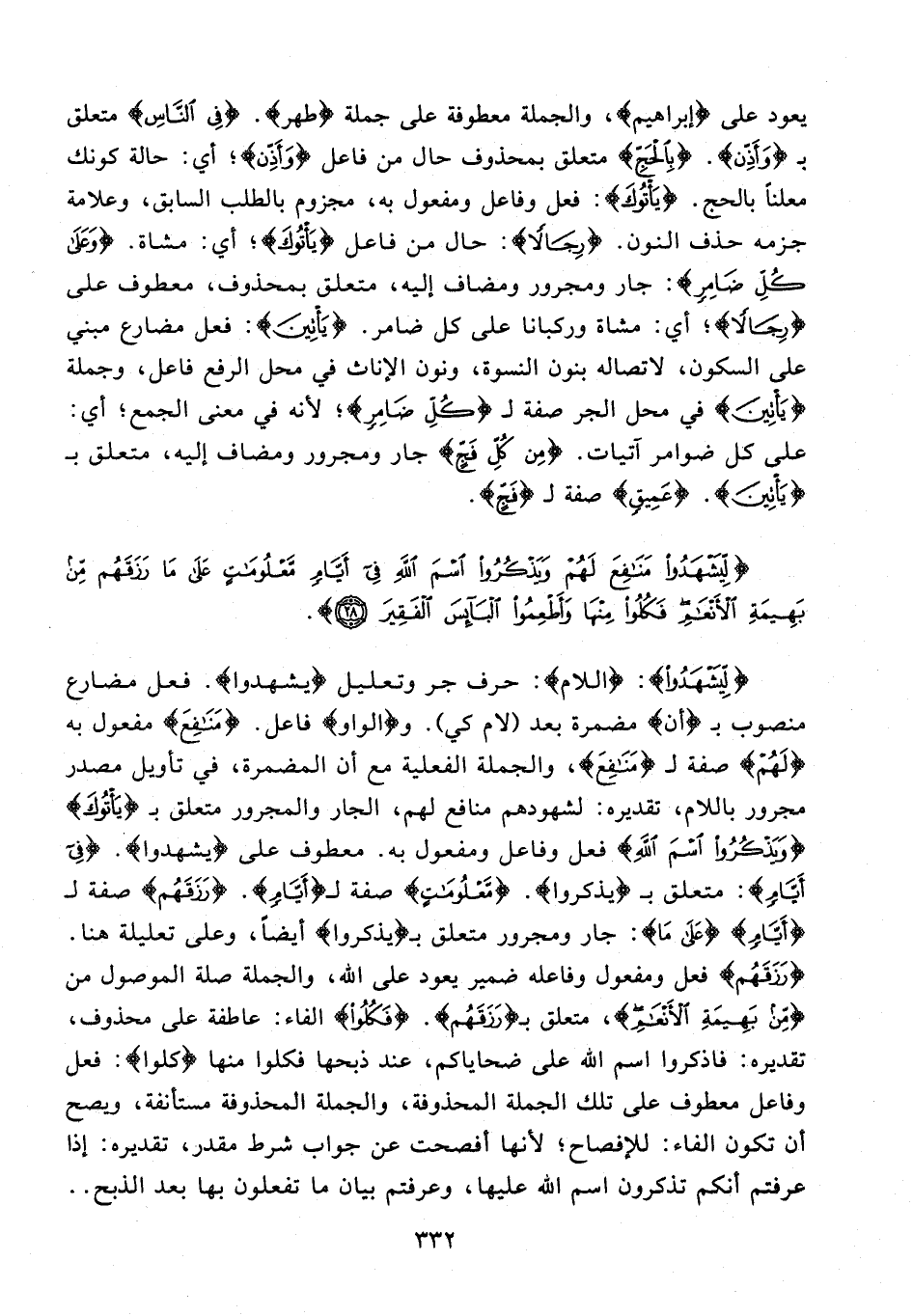 {لِيَشْهَدُوا}: {اللام}: حرف جر وتعليل {يشهدوا}. فعل مضارع منصوب بـ {أن} مضمرة بعد (لام كي). و {الواو} فاعل. {مَنَافِعَ} مفعول به {لَهُمْ} صفة لـ {مَنَافِعَ}، والجملة الفعلية مع أن المضمرة، في تأويل مصدر مجرور باللام، تقديره: لشهودهم منافع لهم، الجار والمجرور متعلق بـ {يَأْتُوكَ} {وَيَذْكُرُوا اسْمَ اللَّهِ} فعل وفاعل ومفعول به. معطوف على {يشهدوا}. {فِي أَيَّامٍ}: متعلق بـ {يذكروا}. {مَعْلُومَاتٍ} صفة لـ {أَيَّامٍ}. {رَزَقَهُمْ} صفة لـ {أَيَّامٍ} {عَلَى مَا}: جار ومجرور متعلق بـ {يذكروا} أيضًا، وعلى تعليلة هنا. {رَزَقَهُمْ} فعل ومفعول وفاعله ضمير يعود على الله، والجملة صلة الموصول من {مِنْ بَهِيمَةِ الْأَنْعَامِ}، متعلق بـ {رَزَقَهُمْ}. {فَكُلُوا} الفاء: عاطفة على محذوف، تقديره: فاذكروا اسم الله على ضحاياكم، عند ذبحها فكلوا منها {كلوا}: فعل وفاعل معطوف على تلك الجملة المحذوفة، والجملة المحذوفة مستأنفة، ويصح أن تكون الفاء: للإفصاح؛ لأنها أفصحت عن جواب شرط مقدر، تقديره: إذا عرفتم أنكم تذكرون اسم الله عليها، وعرفتم بيان ما تفعلون بها بعد الذبح ..