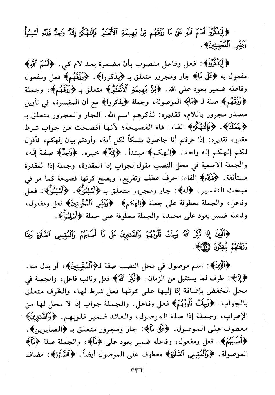 {الَّذِينَ}: اسم موصول في محل النصب صفة لـ {الْمُخْبِتِينَ}، أو بدل منه. {إِذَا}: ظرف لما يستقبل من الزمان. {ذُكِرَ اللَّهُ} فعل ونائب فاعل، والجملة في محل الخفض بإضافة إذا إليها على كونها فعل شرط لها، والظرف متعلق بالجواب. {وَجِلَتْ قُلُوبُهُمْ} فعل وفاعل. والجملة جواب إذا لا محل لها من الإعراب، وجملة إذا صلة الموصول، والعائد ضمير قلوبهم. {وَالصَّابِرِينَ} معطوف على الموصول. {عَلَى مَا}: جار ومجرور متعلق بـ {الصابرين}. {أَصَابَهُمْ}. فعل ومفعول، وفاعله ضمير يعود على {مَا}، والجملة صلة {مَا} الموصولة. {وَالْمُقِيمِي الصَّلَاةِ} معطوف على الموصول أيضًا. {الصَّلَاةِ}: مضاف
