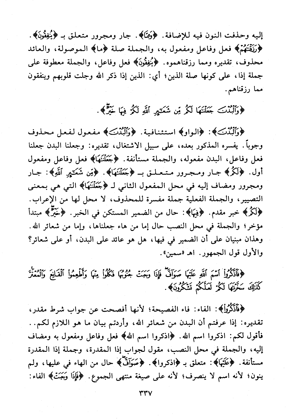 {فَاذْكُرُوا}: الفاء: فاء الفصيحة؛ لأنها أفصحت عن جواب شرط مقدر، تقديره: إذا عرفتم أن البدن من شعائر الله، وأردتم بيان ما هو اللازم لكم .. فأقول لكم: اذكروا اسم الله. {اذكروا اسم الله} فعل وفاعل ومفعول به ومضاف إليه، والجملة في محل النصب، مقول لجواب إذا المقدرة، وجملة إذا المقدرة مستأنفة. {عَلَيْهَا}: متعلق بـ {اذكروا}. {صَوَافَّ} حال من الهاء في عليها، ولم ينون؛ لأنه اسم لا ينصرف؛ لأنه على صيغة منتهى المجموع. {فَإِذَا وَجَبَتْ} الفاء: