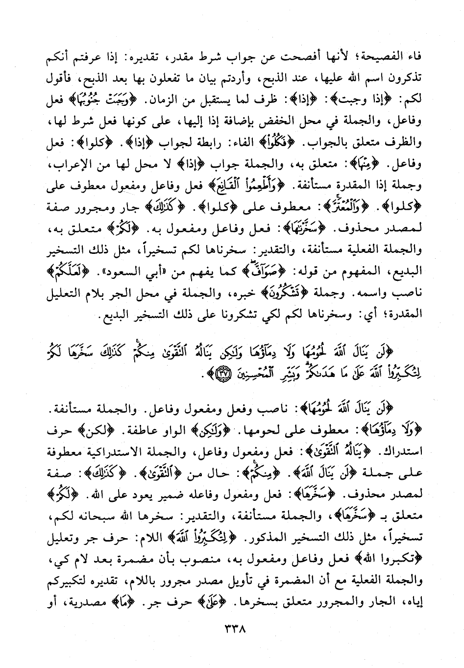 {لَنْ يَنَالَ اللَّهَ لُحُومُهَا}: ناصب وفعل ومفعول وفاعل. والجملة مستأنفة. {وَلَا دِمَاؤُهَا}: معطوف على لحومها. {وَلَكِنْ} الواو عاطفة. {لكن} حرف استدراك. {يَنَالُهُ التَّقْوَى}: فعل ومفعول وفاعل، والجملة الاستدراكية معطوفة على جملة {لَنْ يَنَالَ اللَّهَ}. {مِنْكُمْ}: حال من {التَّقْوَى}. {كَذَلِكَ}: صفة لمصدر محذوف. {سَخَّرَهَا}: فعل ومفعول وفاعله ضمير يعود على الله. {لَكُمْ} متعلق بـ {سَخَّرَهَا}، والجملة مستأنفة، والتقدير: سخرها الله سبحانه لكم، تسخيرًا، مثل ذلك التسخير المذكور. {لِتُكَبِّرُوا اللَّهَ} اللام: حرف جر وتعليل {تكبروا الله} فعل وفاعل ومفعول به، منصوب بأن مضمرة بعد لام كي، والجملة الفعلية مع أن المضمرة في تأويل مصدر مجرور باللام، تقديره لتكبيركم إياه، الجار والمجرور متعلق بسخرها. {عَلَى} حرف جر. {مَا} مصدرية، أو