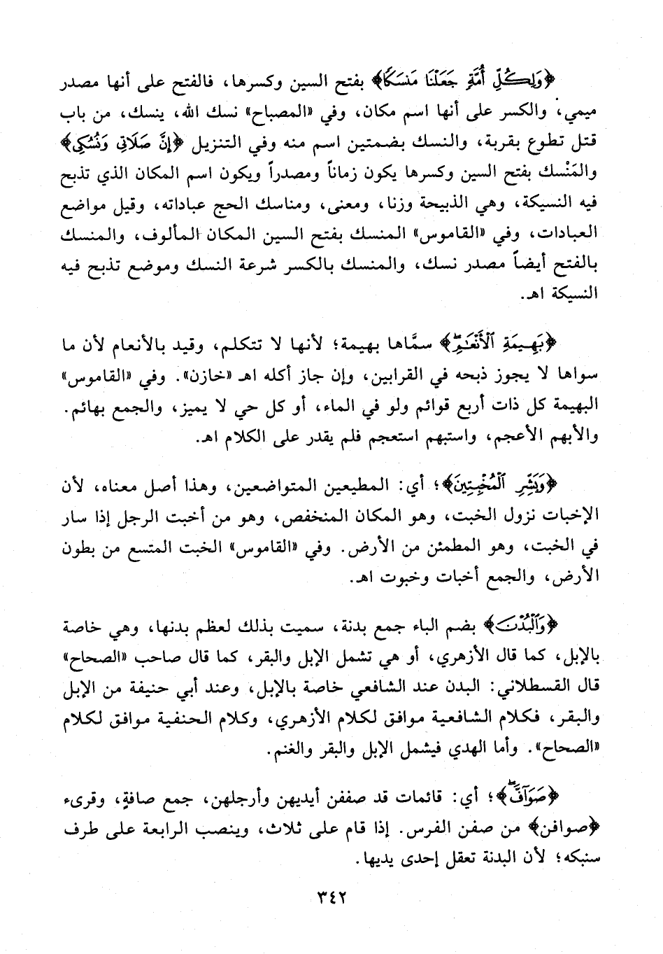 {وَلِكُلِّ أُمَّةٍ جَعَلْنَا مَنْسَكًا} بفتح السين وكسرها، فالفتح على أنها مصدر ميمي، والكسر على أنها اسم مكان، وفي "المصباح" نسك الله، ينسك، من باب قتل تطوع بقربة، والنسك بضمتين اسم منه وفي التنزيل {إِنَّ صَلَاتِي وَنُسُكِي} والمَنْسك بفتح السين وكسرها يكون زمانًا ومصدرًا ويكون اسم المكان الذي تذبح فيه النسيكة، وهي الذبيحة وزنا، ومعنى، ومناسك الحج عباداته، وقيل مواضع العبادات، وفي "القاموس" المنسك بفتح السين المكان المألوف، والمنسك بالفتح أيضًا مصدر نسك، والمنسك بالكسر شرعة النسك وموضع تذبح فيه النسيكة اهـ.