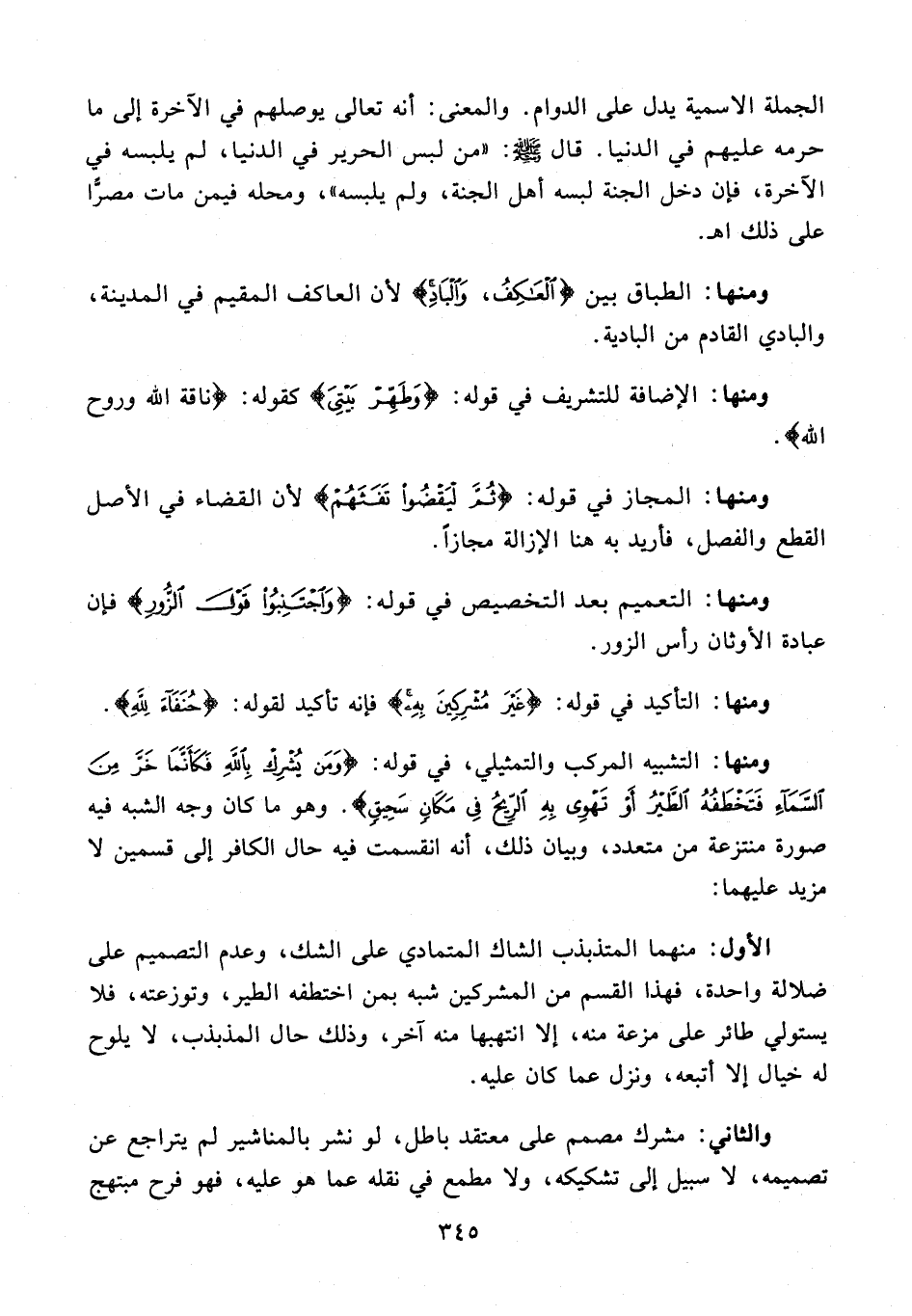 ومنها: التأكيد في قوله: {غَيْرَ مُشْرِكِينَ بِهِ} فإنه تأكيد لقوله: {حُنَفَاءَ لِلَّهِ}.