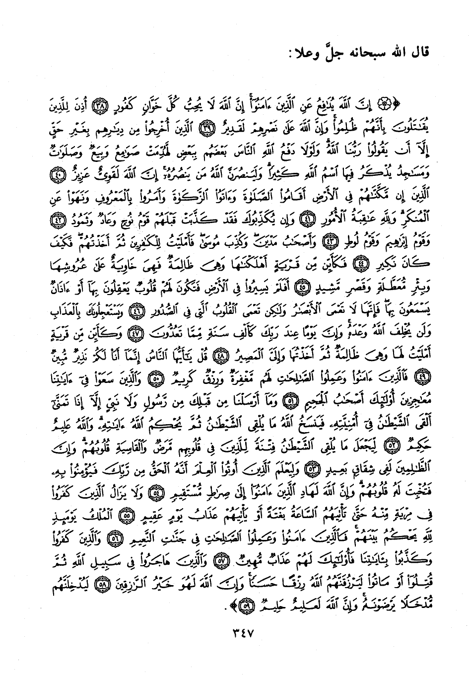 {إِنَّ اللَّهَ يُدَافِعُ عَنِ الَّذِينَ آمَنُوا إِنَّ اللَّهَ لَا يُحِبُّ كُلَّ خَوَّانٍ كَفُورٍ (38) أُذِنَ لِلَّذِينَ يُقَاتَلُونَ بِأَنَّهُمْ ظُلِمُوا وَإِنَّ اللَّهَ عَلَى نَصْرِهِمْ لَقَدِيرٌ (39) الَّذِينَ أُخْرِجُوا مِنْ دِيَارِهِمْ بِغَيْرِ حَقٍّ إِلَّا أَنْ يَقُولُوا رَبُّنَا اللَّهُ وَلَوْلَا دَفْعُ اللَّهِ النَّاسَ بَعْضَهُمْ بِبَعْضٍ لَهُدِّمَتْ صَوَامِعُ وَبِيَعٌ وَصَلَوَاتٌ وَمَسَاجِدُ يُذْكَرُ فِيهَا اسْمُ اللَّهِ كَثِيرًا وَلَيَنْصُرَنَّ اللَّهُ مَنْ يَنْصُرُهُ إِنَّ اللَّهَ لَقَوِيٌّ عَزِيزٌ (40) الَّذِينَ إِنْ مَكَّنَّاهُمْ فِي الْأَرْضِ أَقَامُوا الصَّلَاةَ وَآتَوُا الزَّكَاةَ وَأَمَرُوا بِالْمَعْرُوفِ وَنَهَوْا عَنِ الْمُنْكَرِ وَلِلَّهِ عَاقِبَةُ الْأُمُورِ (41) وَإِنْ يُكَذِّبُوكَ فَقَدْ كَذَّبَتْ قَبْلَهُمْ قَوْمُ نُوحٍ وَعَادٌ وَثَمُودُ (42) وَقَوْمُ إِبْرَاهِيمَ وَقَوْمُ لُوطٍ (43) وَأَصْحَابُ مَدْيَنَ وَكُذِّبَ مُوسَى فَأَمْلَيْتُ لِلْكَافِرِينَ ثُمَّ أَخَذْتُهُمْ فَكَيْفَ كَانَ نَكِيرِ (44) فَكَأَيِّنْ مِنْ قَرْيَةٍ أَهْلَكْنَاهَا وَهِيَ ظَالِمَةٌ فَهِيَ خَاوِيَةٌ عَلَى عُرُوشِهَا وَبِئْرٍ مُعَطَّلَةٍ وَقَصْرٍ مَشِيدٍ (45) أَفَلَمْ يَسِيرُوا فِي الْأَرْضِ فَتَكُونَ لَهُمْ قُلُوبٌ يَعْقِلُونَ بِهَا أَوْ آذَانٌ يَسْمَعُونَ بِهَا فَإِنَّهَا لَا تَعْمَى الْأَبْصَارُ وَلَكِنْ تَعْمَى الْقُلُوبُ الَّتِي فِي الصُّدُورِ (46) وَيَسْتَعْجِلُونَكَ بِالْعَذَابِ وَلَنْ يُخْلِفَ اللَّهُ وَعْدَهُ وَإِنَّ يَوْمًا عِنْدَ رَبِّكَ كَأَلْفِ سَنَةٍ مِمَّا تَعُدُّونَ (47) وَكَأَيِّنْ مِنْ قَرْيَةٍ أَمْلَيْتُ لَهَا وَهِيَ ظَالِمَةٌ ثُمَّ أَخَذْتُهَا وَإِلَيَّ الْمَصِيرُ (48) قُلْ يَا أَيُّهَا النَّاسُ إِنَّمَا أَنَا لَكُمْ نَذِيرٌ مُبِينٌ (49) فَالَّذِينَ آمَنُوا وَعَمِلُوا الصَّالِحَاتِ لَهُمْ مَغْفِرَةٌ وَرِزْقٌ كَرِيمٌ (50) وَالَّذِينَ سَعَوْا فِي آيَاتِنَا مُعَاجِزِينَ أُولَئِكَ أَصْحَابُ الْجَحِيمِ (51) وَمَا أَرْسَلْنَا مِنْ قَبْلِكَ مِنْ رَسُولٍ وَلَا نَبِيٍّ إِلَّا إِذَا تَمَنَّى أَلْقَى الشَّيْطَانُ فِي أُمْنِيَّتِهِ فَيَنْسَخُ اللَّهُ مَا يُلْقِي الشَّيْطَانُ ثُمَّ يُحْكِمُ اللَّهُ آيَاتِهِ وَاللَّهُ عَلِيمٌ حَكِيمٌ (52) لِيَجْعَلَ مَا يُلْقِي الشَّيْطَانُ فِتْنَةً لِلَّذِينَ فِي قُلُوبِهِمْ مَرَضٌ وَالْقَاسِيَةِ قُلُوبُهُمْ وَإِنَّ الظَّالِمِينَ لَفِي شِقَاقٍ بَعِيدٍ (53) وَلِيَعْلَمَ الَّذِينَ أُوتُوا الْعِلْمَ أَنَّهُ الْحَقُّ مِنْ رَبِّكَ فَيُؤْمِنُوا بِهِ فَتُخْبِتَ لَهُ قُلُوبُهُمْ وَإِنَّ اللَّهَ لَهَادِ الَّذِينَ آمَنُوا إِلَى صِرَاطٍ مُسْتَقِيمٍ (54) وَلَا يَزَالُ الَّذِينَ كَفَرُوا فِي مِرْيَةٍ مِنْهُ حَتَّى تَأْتِيَهُمُ السَّاعَةُ بَغْتَةً أَوْ يَأْتِيَهُمْ عَذَابُ يَوْمٍ عَقِيمٍ (55) الْمُلْكُ يَوْمَئِذٍ لِلَّهِ يَحْكُمُ بَيْنَهُمْ فَالَّذِينَ آمَنُوا وَعَمِلُوا الصَّالِحَاتِ فِي جَنَّاتِ النَّعِيمِ (56) وَالَّذِينَ كَفَرُوا وَكَذَّبُوا بِآيَاتِنَا فَأُولَئِكَ لَهُمْ عَذَابٌ مُهِينٌ (57) وَالَّذِينَ هَاجَرُوا فِي سَبِيلِ اللَّهِ ثُمَّ قُتِلُوا أَوْ مَاتُوا لَيَرْزُقَنَّهُمُ اللَّهُ رِزْقًا حَسَنًا وَإِنَّ اللَّهَ لَهُوَ خَيْرُ الرَّازِقِينَ (58) لَيُدْخِلَنَّهُمْ مُدْخَلًا يَرْضَوْنَهُ وَإِنَّ اللَّهَ لَعَلِيمٌ حَلِيمٌ (59)}