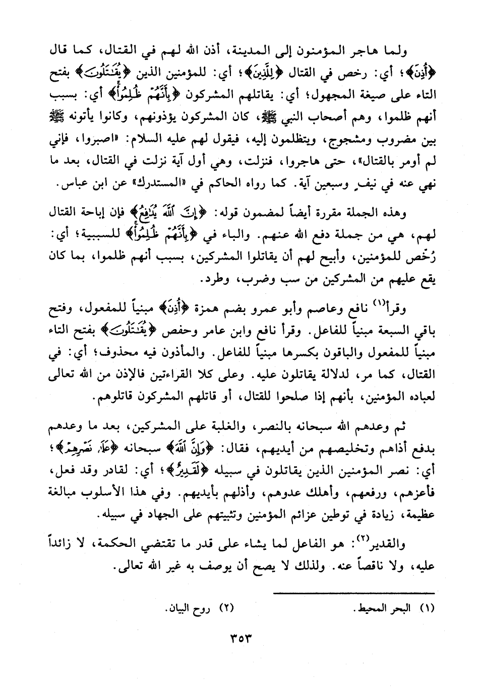 وقرأ (¬1) نافع وعاصم وأبو عمرو بضم همزة {أُذِنَ} مبنيًا للمفعول، وفتح باقي السبعة مبنيًا للفاعل. وقرأ نافع وابن عامر وحفص {يُقَاتَلُونَ} بفتح التاء مبنيًا للمفعول والباقون بكسرها مبنيًا للفاعل. والمأذون فيه محذوف؛ أي: في القتال، كما مر، لدلالة يقاتلون عليه. وعلى كلا القراءتين فالإذن من الله تعالى لعباده المؤمنين، بأنهم إذا صلحوا للقتال، أو قاتلهم المشركون قاتلوهم.
